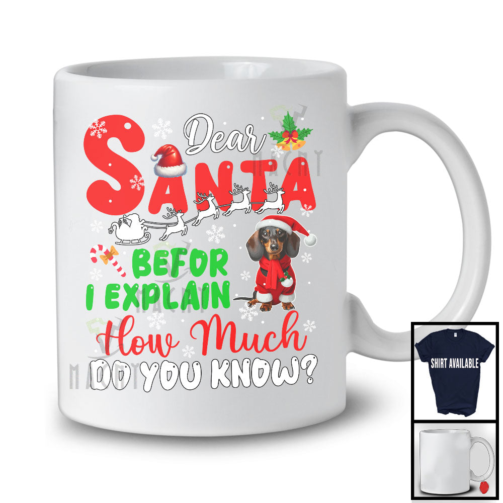 Dear Santa Before I Explain; Wonderful Christmas Dachshund Santa Naughty; Snowing Family T-Shirt. This cotton t-shirt is a durable staple product with a classic fit. One of the most popular items, it has a relaxed style made for everyday and casual wear.