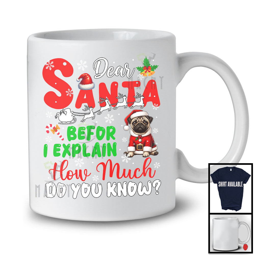 Dear Santa Before I Explain; Wonderful Christmas Pug Santa Naughty; Snowing Family T-Shirt. This cotton t-shirt is a durable staple product with a classic fit. One of the most popular items, it has a relaxed style made for everyday and casual wear.
