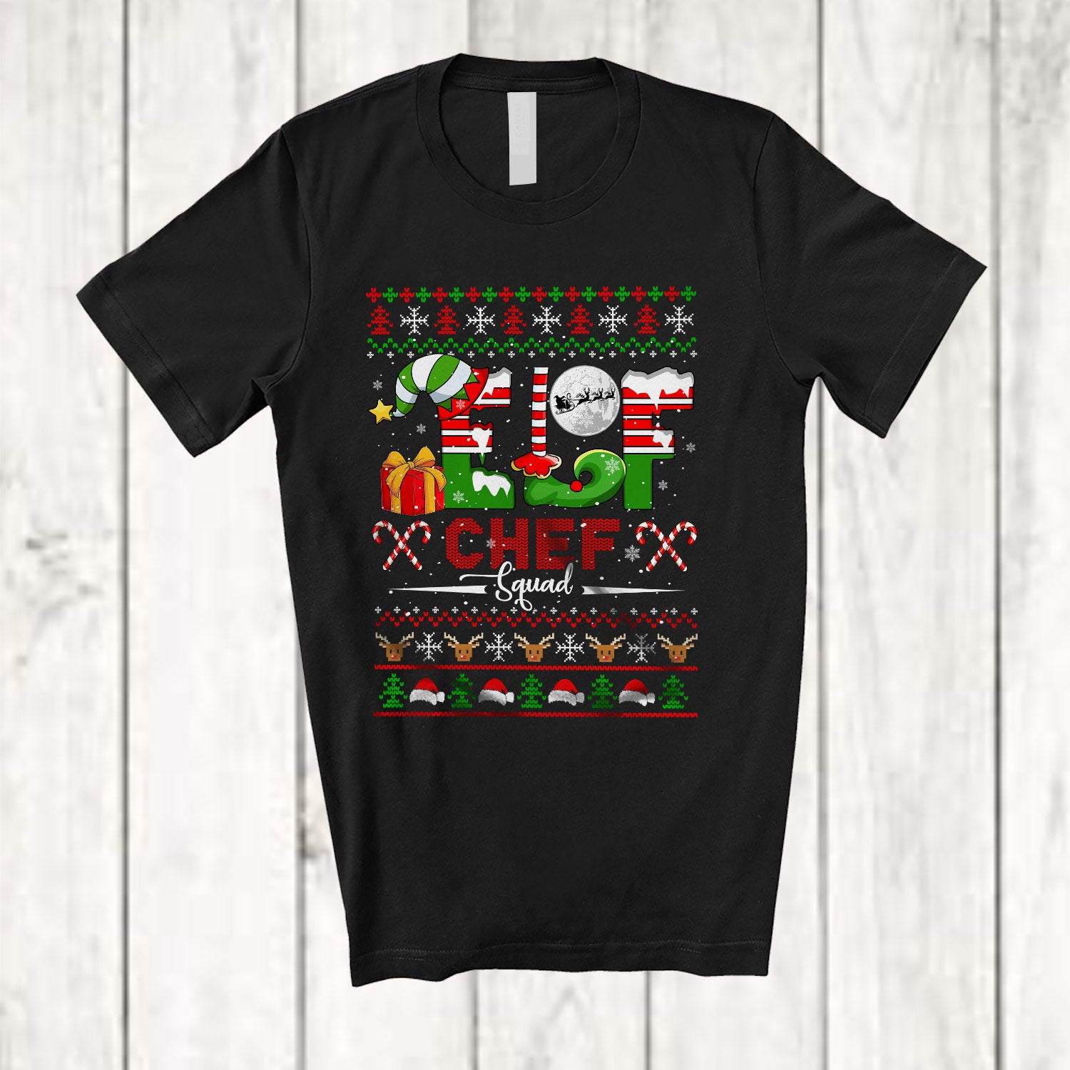 Elf Chef Squad; Awesome Christmas Sweater Moon Elf Lover; Pajama Jobs Family Group T-Shirt. This cotton t-shirt is a durable staple product with a classic fit. One of the most popular items, it has a relaxed style made for everyday and casual wear.