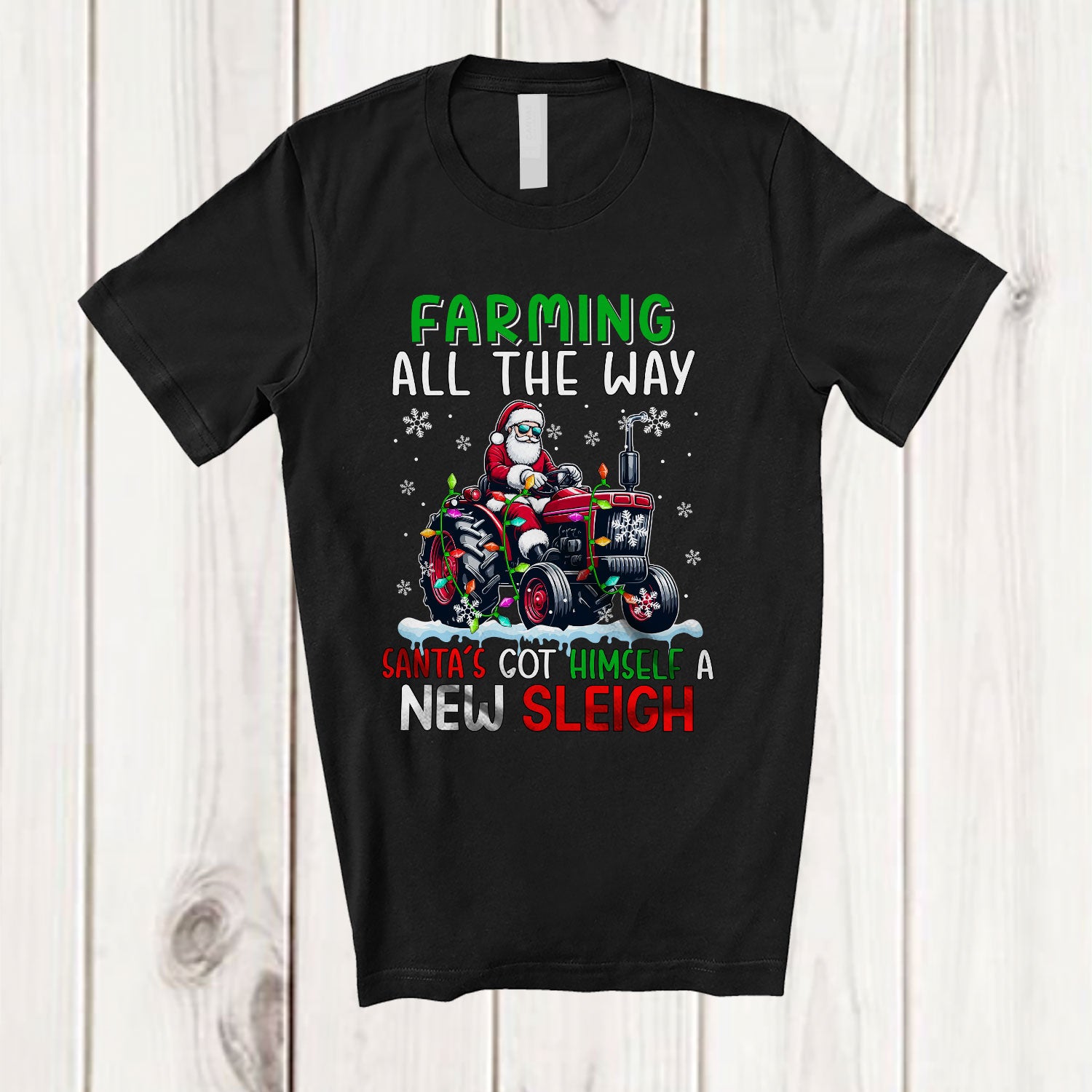 Farming All The Way Santa's Got A New Sleigh; Joyful Christmas Santa Driving Tractor; Farmer T-Shirt. This cotton t-shirt is a durable staple product with a classic fit. One of the most popular items, it has a relaxed style made for everyday and casual wear.
