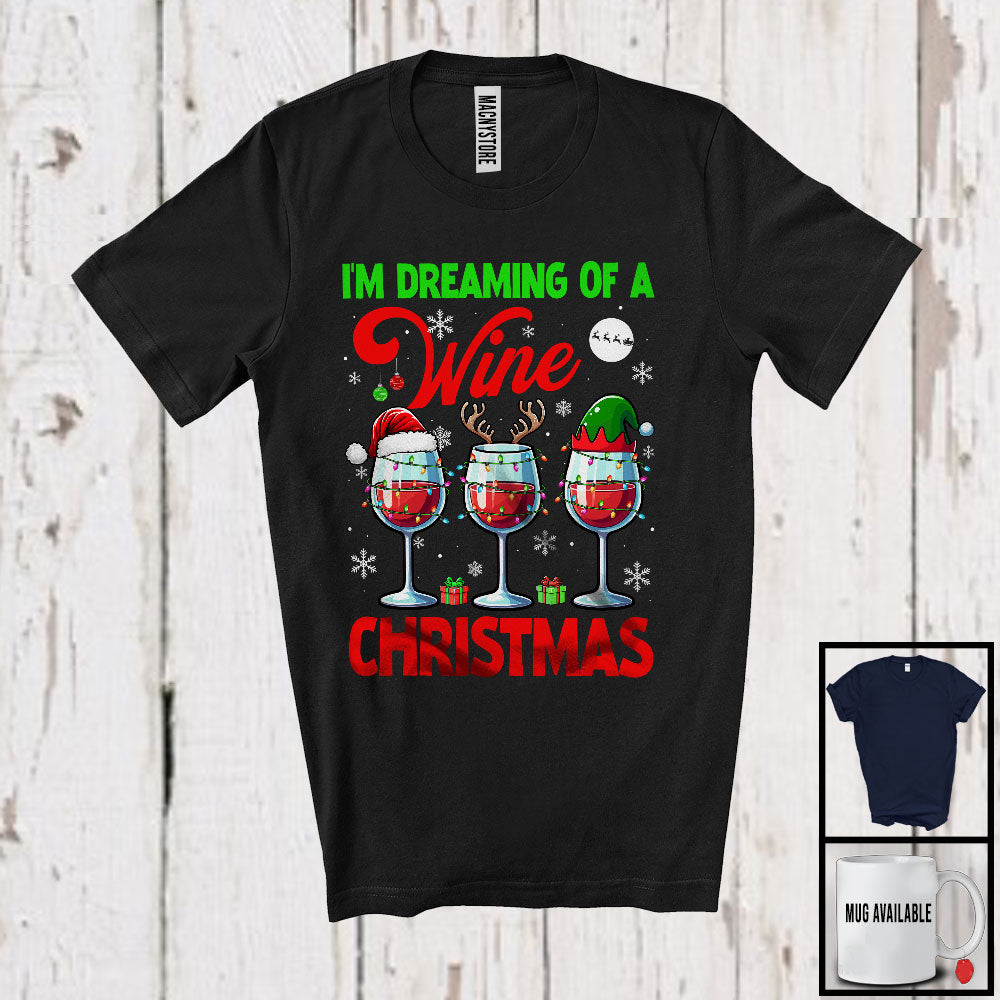 I'm Dreaming Of A Wine Christmas; Joyful X-mas Lights Three Wine Glasses; Drunker Drinking T-Shirt. This cotton t-shirt is a durable staple product with a classic fit. One of the most popular items, it has a relaxed style made for everyday and casual wear.