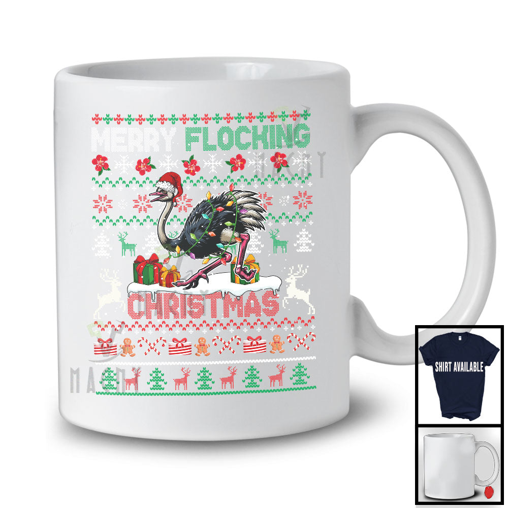 • Merry Flocking Christmas; Awesome X-mas Lights Sweater Ostrich Santa; Snowing Bird Lover T-Shirt. This cotton t-shirt is a durable staple product with a classic fit. One of the most popular items, it has a relaxed style made for everyday and casual wear.