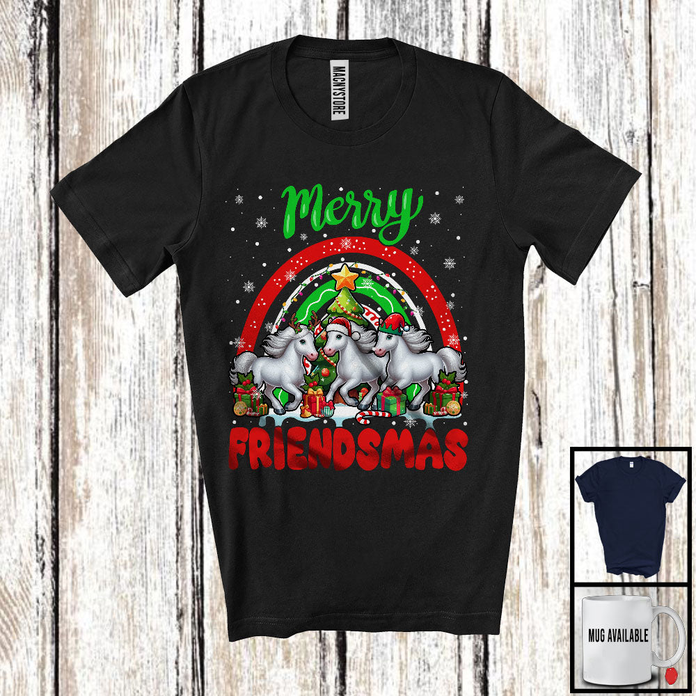 Merry Friendmas, Amazing Christmas Three Horse Santa ELF Reindeer, Rainbow Snowing T-Shirt