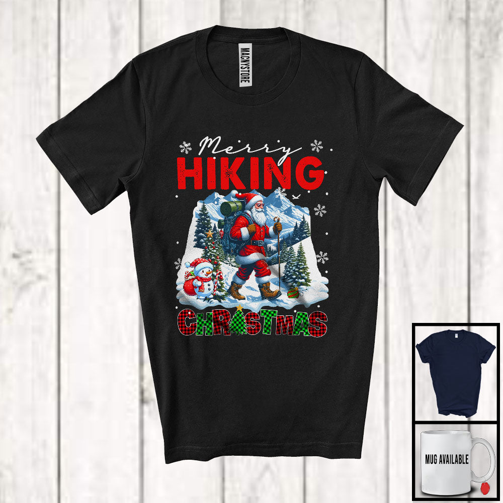 Merry Hiking; Joyful Christmas Lights Santa Hiking Lover; X-mas Snowing Around T-Shirt. This cotton t-shirt is a durable staple product with a classic fit. One of the most popular items, it has a relaxed style made for everyday and casual wear.