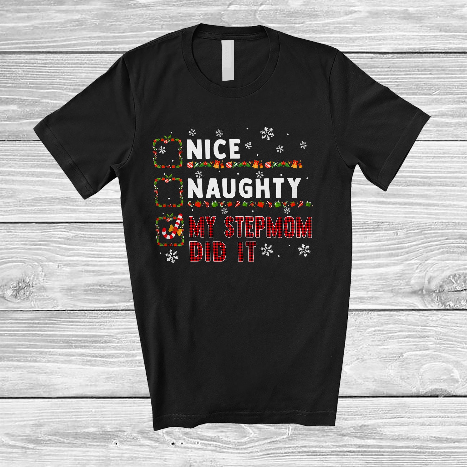 • Nice Naughty My Stepmom Did It; Wonderful Christmas Red Plaid Santa Snowing; Family Group T-Shirt. This cotton t-shirt is a durable staple product with a classic fit. One of the most popular items, it has a relaxed style made for everyday and casual wear.