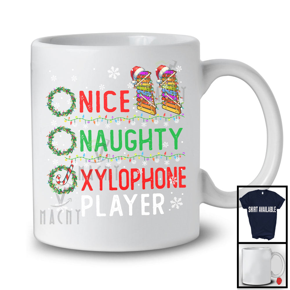 Nice Naughty Xylophone Player; Amazing Christmas Santa List; X-mas Musical Instruments T-Shirt. This cotton t-shirt is a durable staple product with a classic fit. One of the most popular items, it has a relaxed style made for everyday and casual wear.
