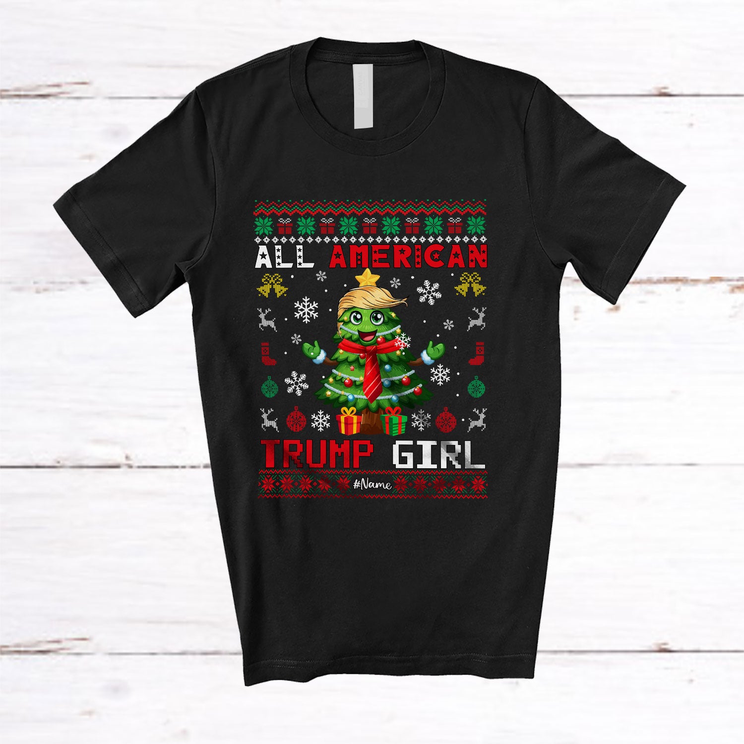 Personalized All American Trump Girl; Merry Christmas Custom Name X-mas Tree Trump Back 2024; Sweater T-Shirt. This cotton t-shirt is a durable staple product with a classic fit. One of the most popular items, it has a relaxed style made for everyday and casual wear.