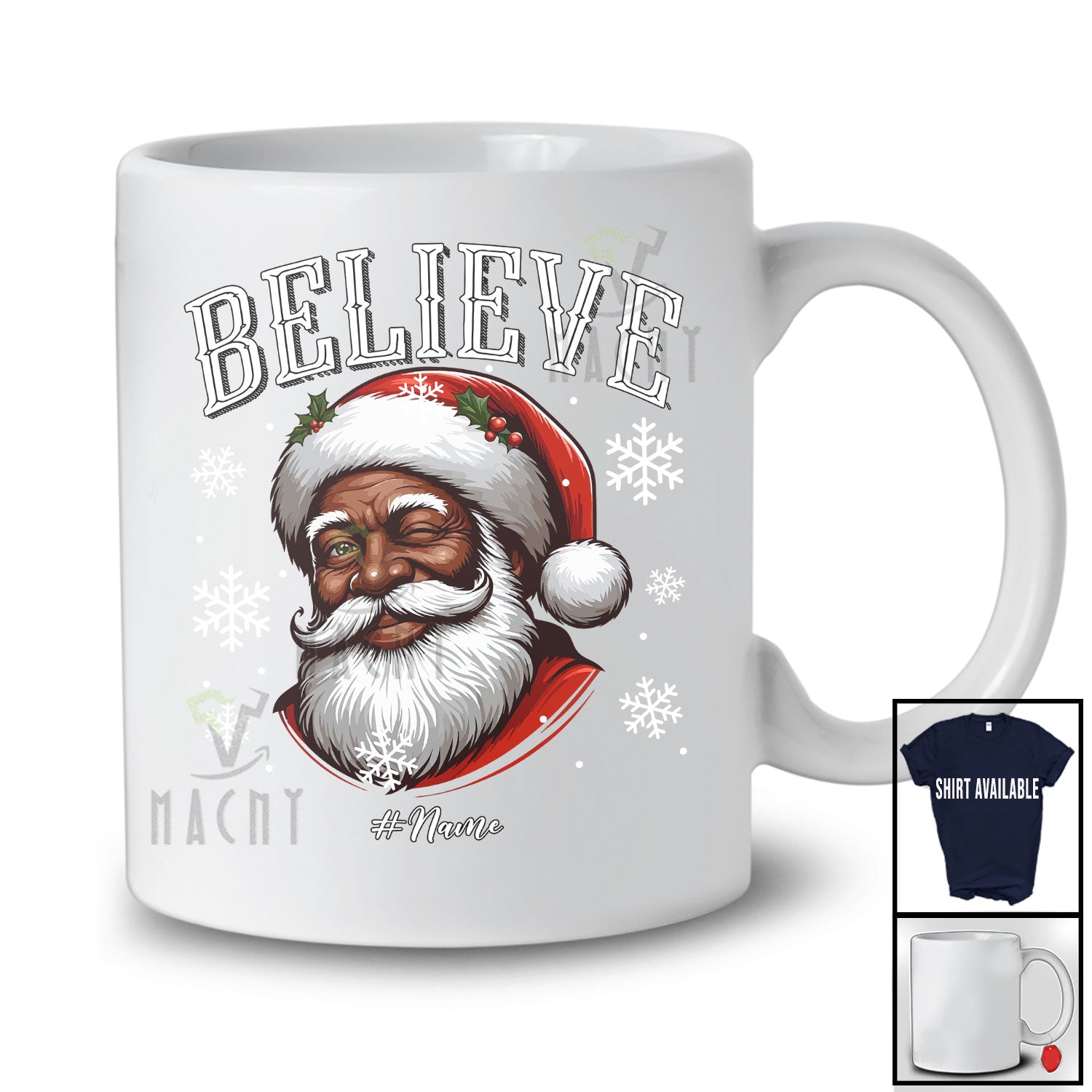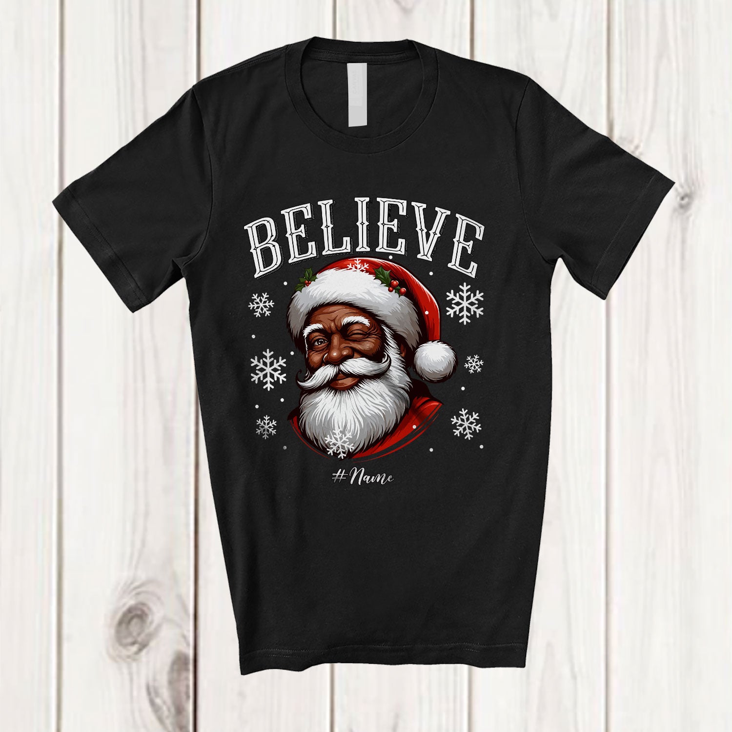 Personalized Believe; Amusing Christmas Black Afro Santa Face; Custom Name African Family T-Shirt. This cotton t-shirt is a durable staple product with a classic fit. One of the most popular items, it has a relaxed style made for everyday and casual wear.