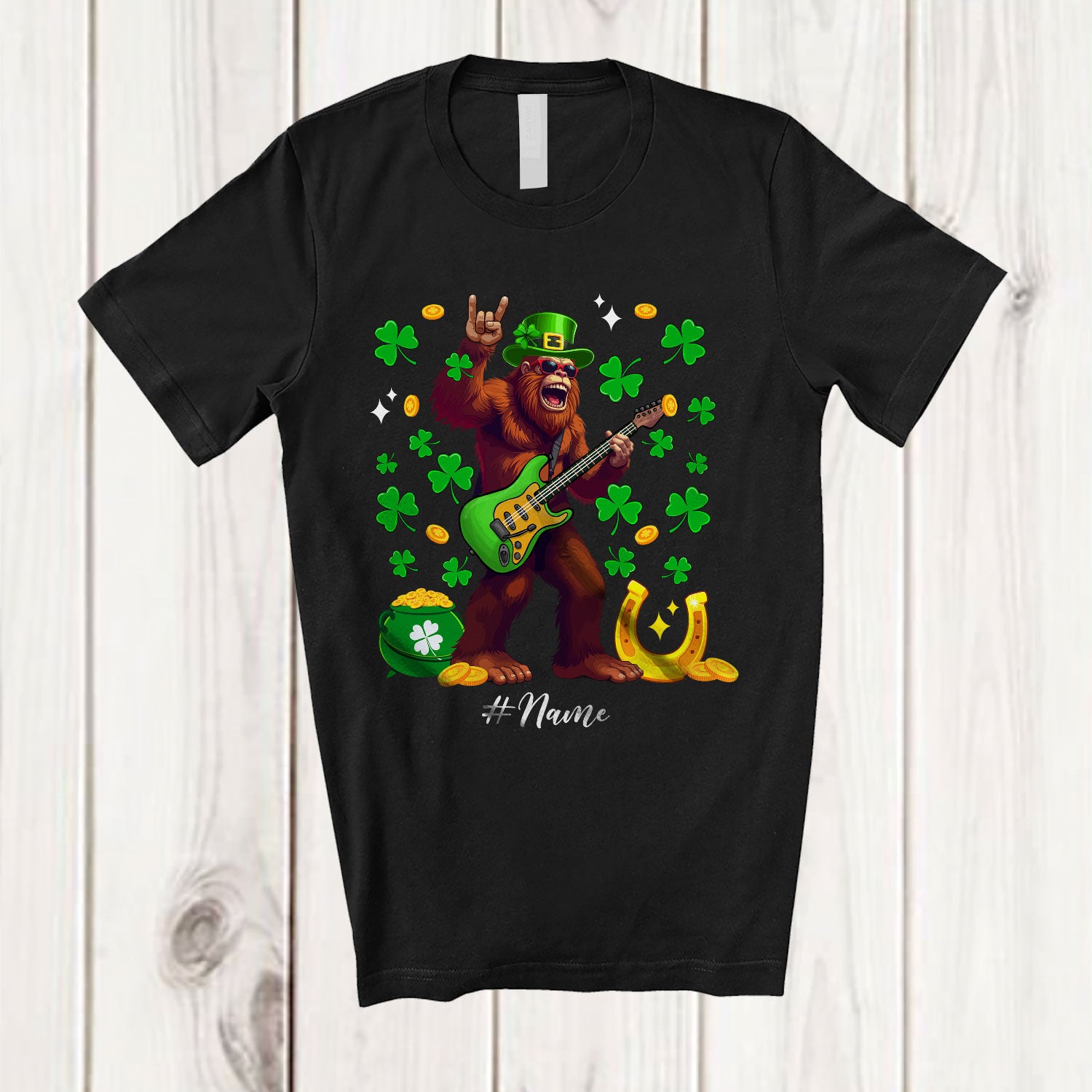 Personalized Bigfoot Rock; Lovely St. Patrick's Day Bigfoot Bass Player; Custom Name Guitarist T-Shirt