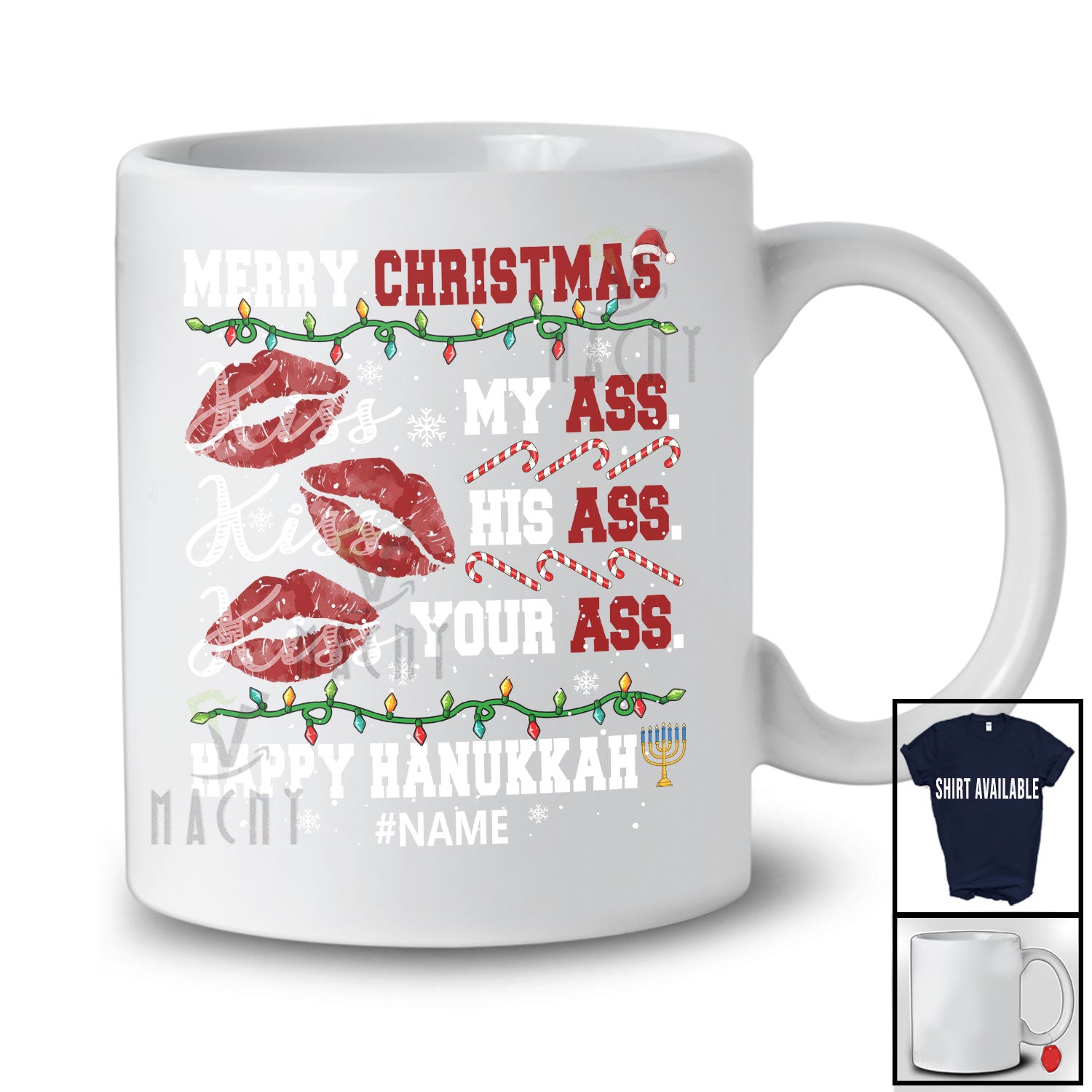 • Personalized Christmas Kiss Ass Happy Hanukkah; Joyful Custom Name Naughty Adult; Menorah T-Shirt. This cotton t-shirt is a durable staple product with a classic fit. One of the most popular items, it has a relaxed style made for everyday and casual wear.