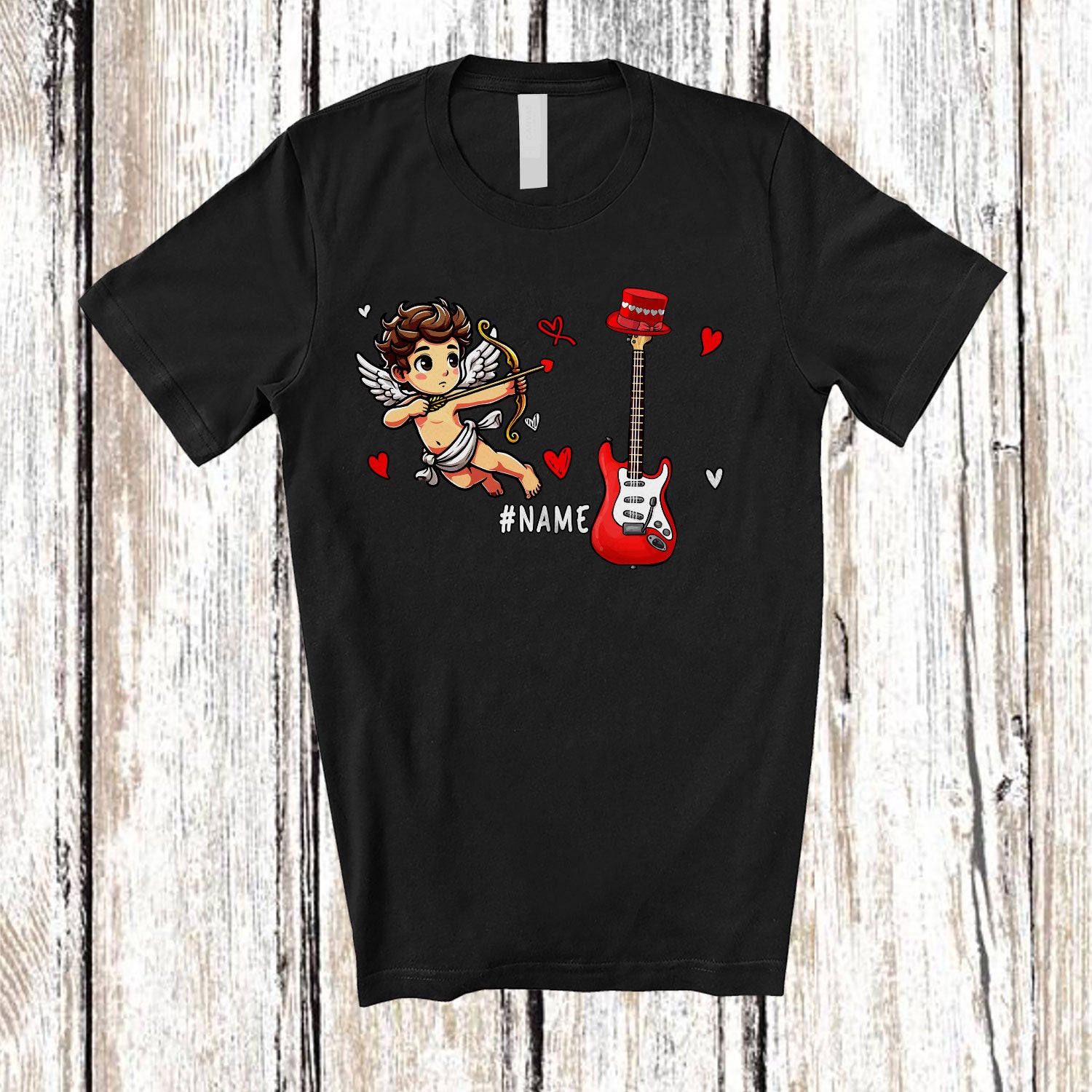 Personalized Cupid With Guitar; Lovely Valentine Hearts; Custom Name Guitar Player T-Shirt