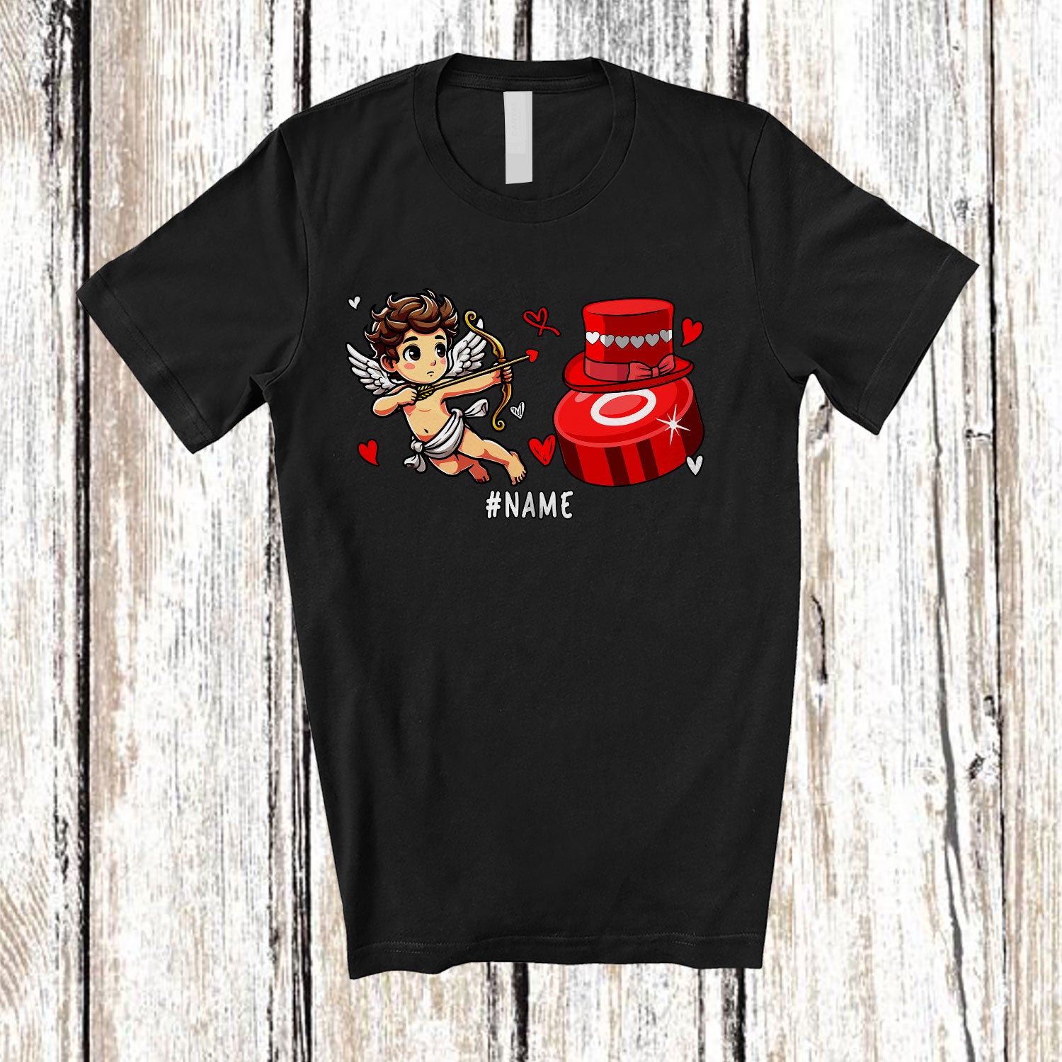 Personalized Cupid With Ice Hockey Ball; Lovely Valentine Hearts; Custom Name Ice Hockey Player T-Shirt. This cotton t-shirt is a durable staple product with a classic fit. One of the most popular items, it has a relaxed style made for everyday and casual wear.