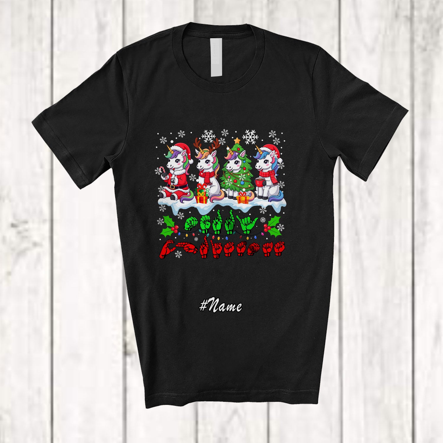 Personalized Custom Name ASL Sign Language Merry Christmas; Lovely X-mas Snow Unicorn T-Shirt