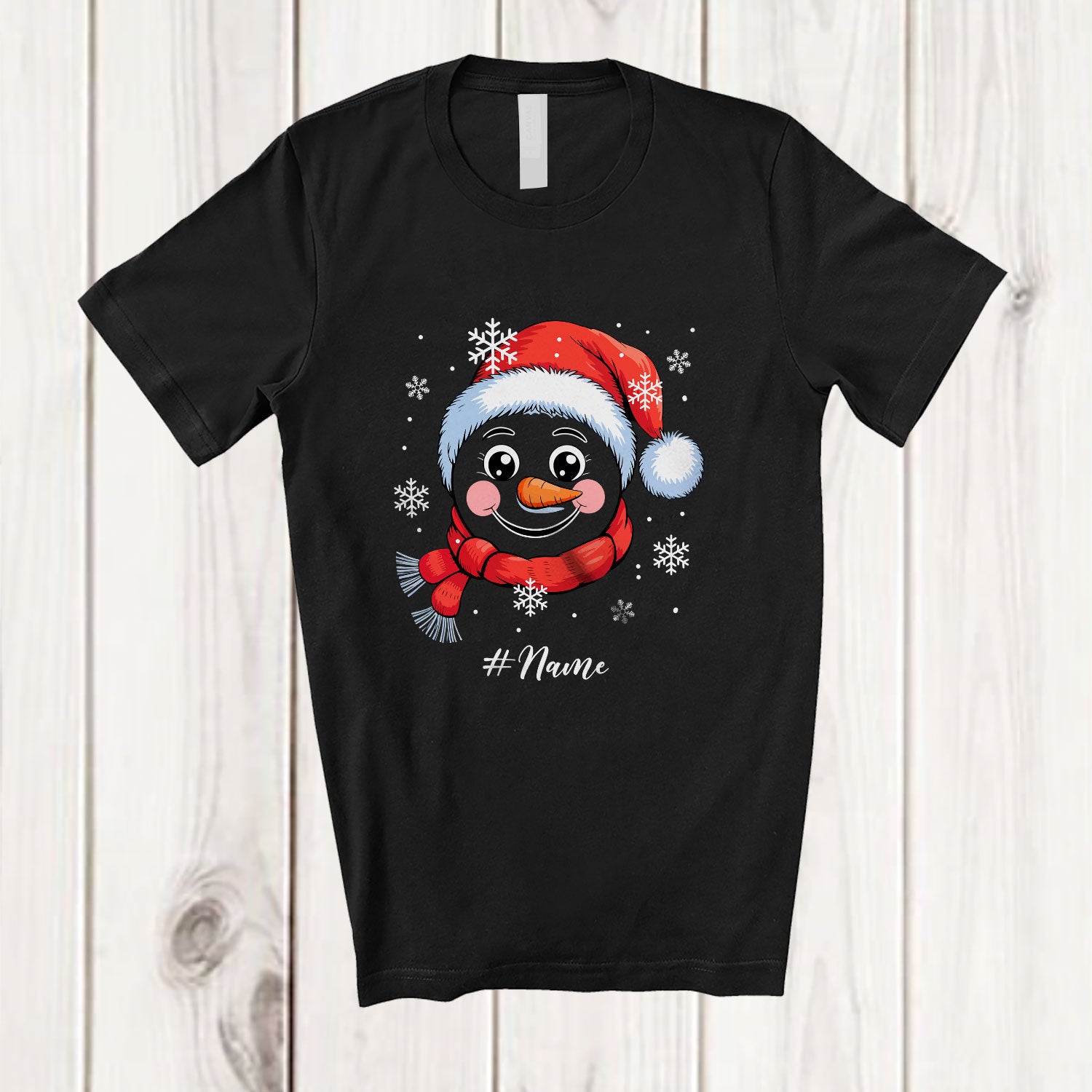 • Personalized Custom Name Christmas Snowman Face; Joyful X-mas Lights Snowing Family T-Shirt. This cotton t-shirt is a durable staple product with a classic fit. One of the most popular items, it has a relaxed style made for everyday and casual wear.