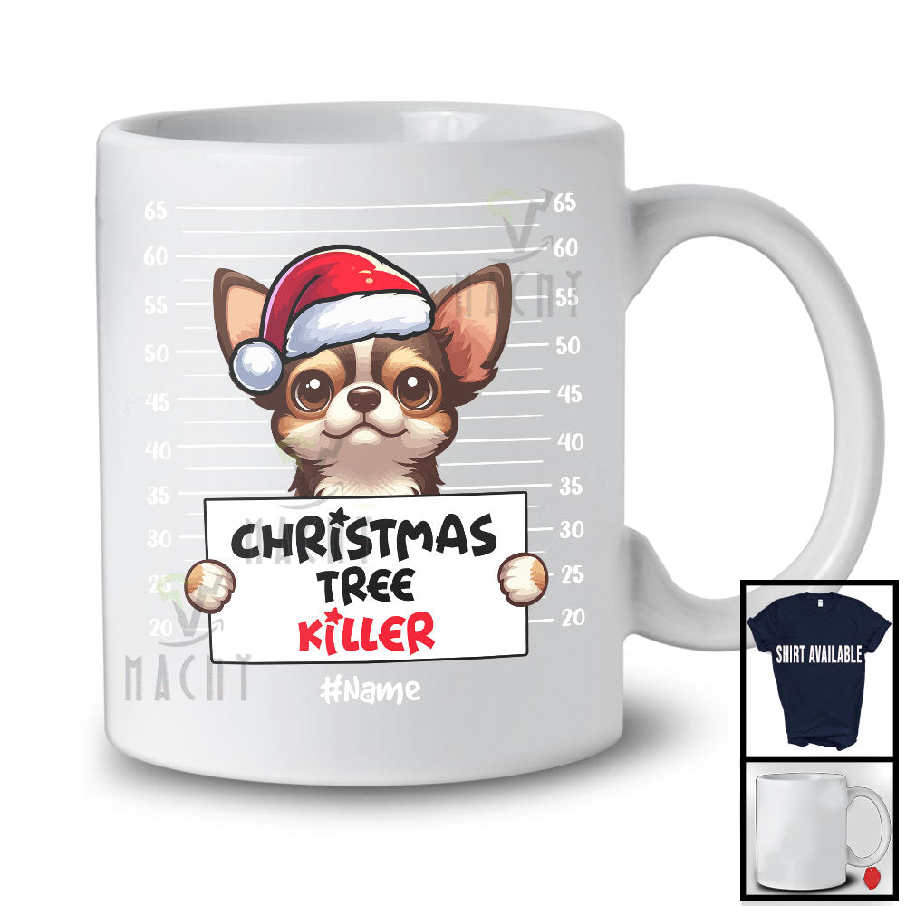 Personalized Custom Name Christmas Tree Killer; Lovely Santa Chihuahua Dog's Fault; Damage Tree T-Shirt. This cotton t-shirt is a durable staple product with a classic fit. One of the most popular items, it has a relaxed style made for everyday and casual wear.