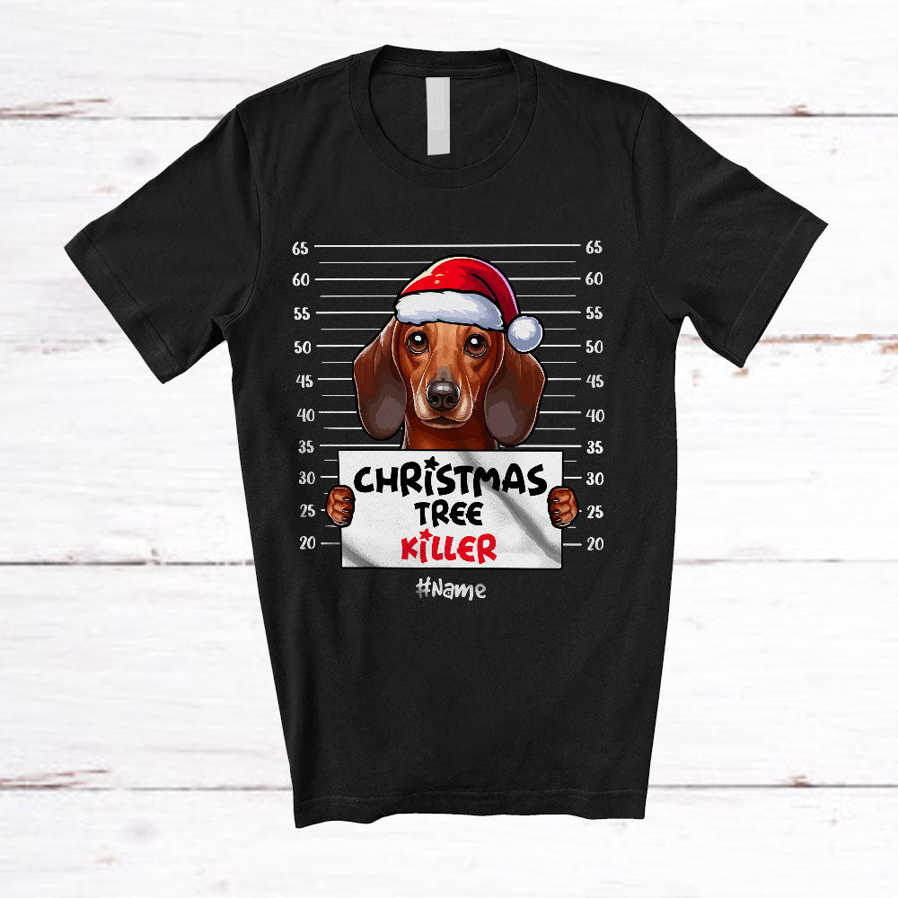 • Personalized Custom Name Christmas Tree Killer; Lovely Santa Dachshund Dog's Fault; Damage Tree T-Shirt. This cotton t-shirt is a durable staple product with a classic fit. One of the most popular items, it has a relaxed style made for everyday and casual wear.