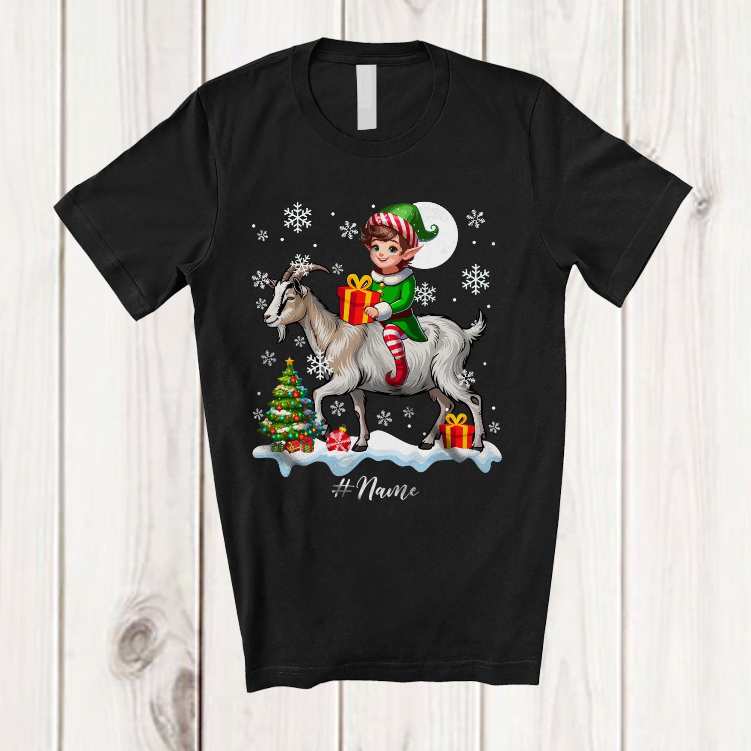 Personalized Custom Name Elf Riding A Goat; Amazing Christmas Snowing Goat Farm Farmer T-Shirt. This cotton t-shirt is a durable staple product with a classic fit. One of the most popular items, it has a relaxed style made for everyday and casual wear.