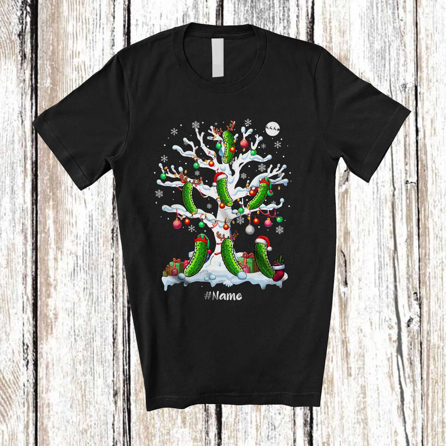 Personalized Custom Name Elf Santa Pickle On Christmas Tree; Awesome X-mas Lights Snowing T-Shirt. This cotton t-shirt is a durable staple product with a classic fit. One of the most popular items, it has a relaxed style made for everyday and casual wear.