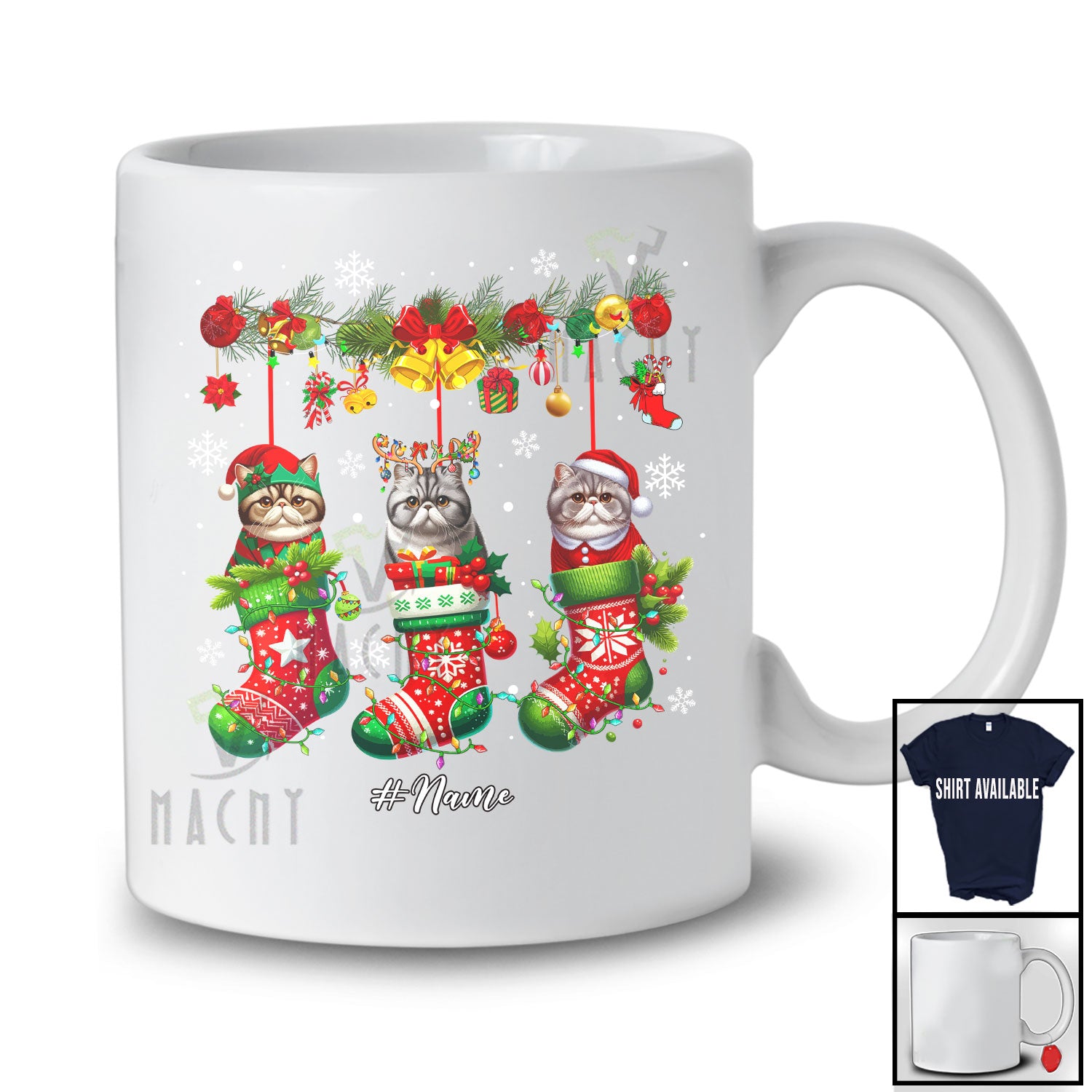 Personalized Custom Name Exotic Shorthair Cat In Three Christmas Socks; Lovely X-mas Lights Snow T-Shirt. This cotton t-shirt is a durable staple product with a classic fit. One of the most popular items, it has a relaxed style made for everyday and casual wear.