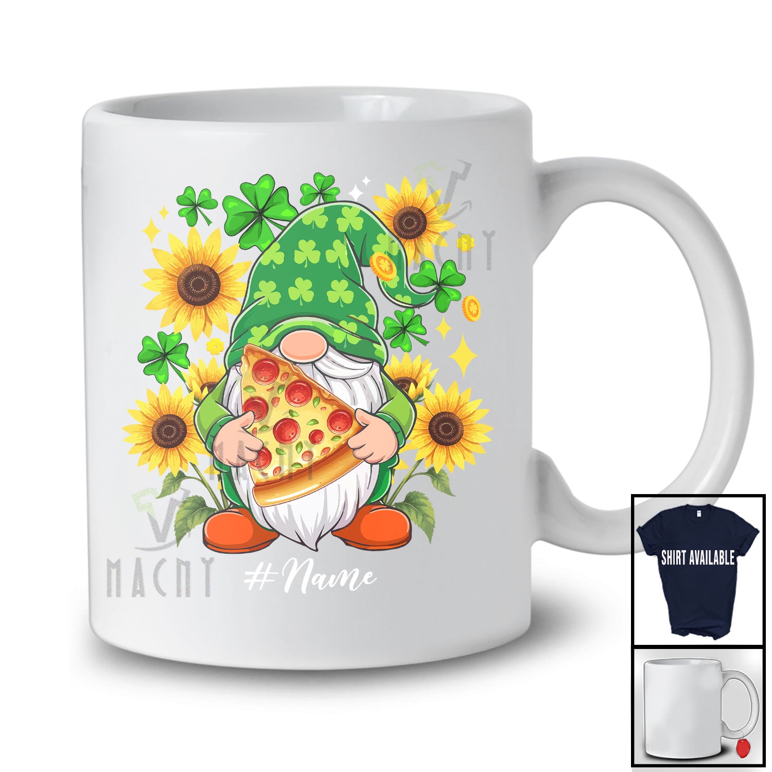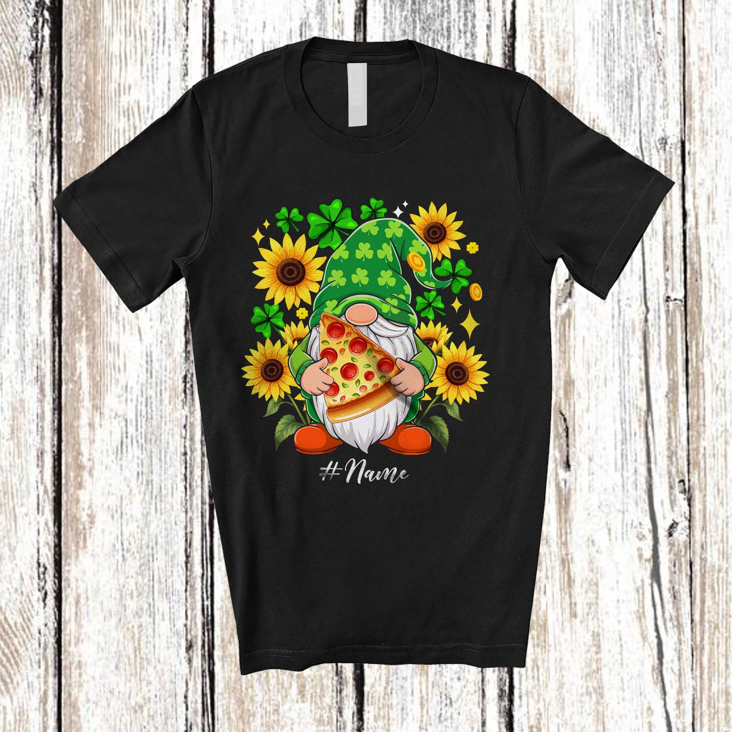 • Personalized Custom Name Gnome Holding Pizza Sunflower; Lovely St. Patrick's Day Shamrocks T-Shirt. This cotton t-shirt is a durable staple product with a classic fit. One of the most popular items, it has a relaxed style made for everyday and casual wear.