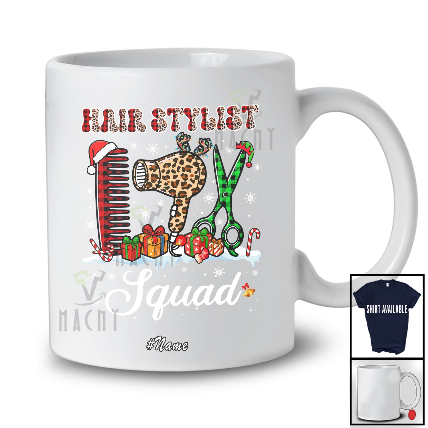 • Personalized Custom Name Hair Stylist Squad; Lovely Christmas Leopard Plaid Hair Stylist Tools T-Shirt. This cotton t-shirt is a durable staple product with a classic fit. One of the most popular items, it has a relaxed style made for everyday and casual wear.