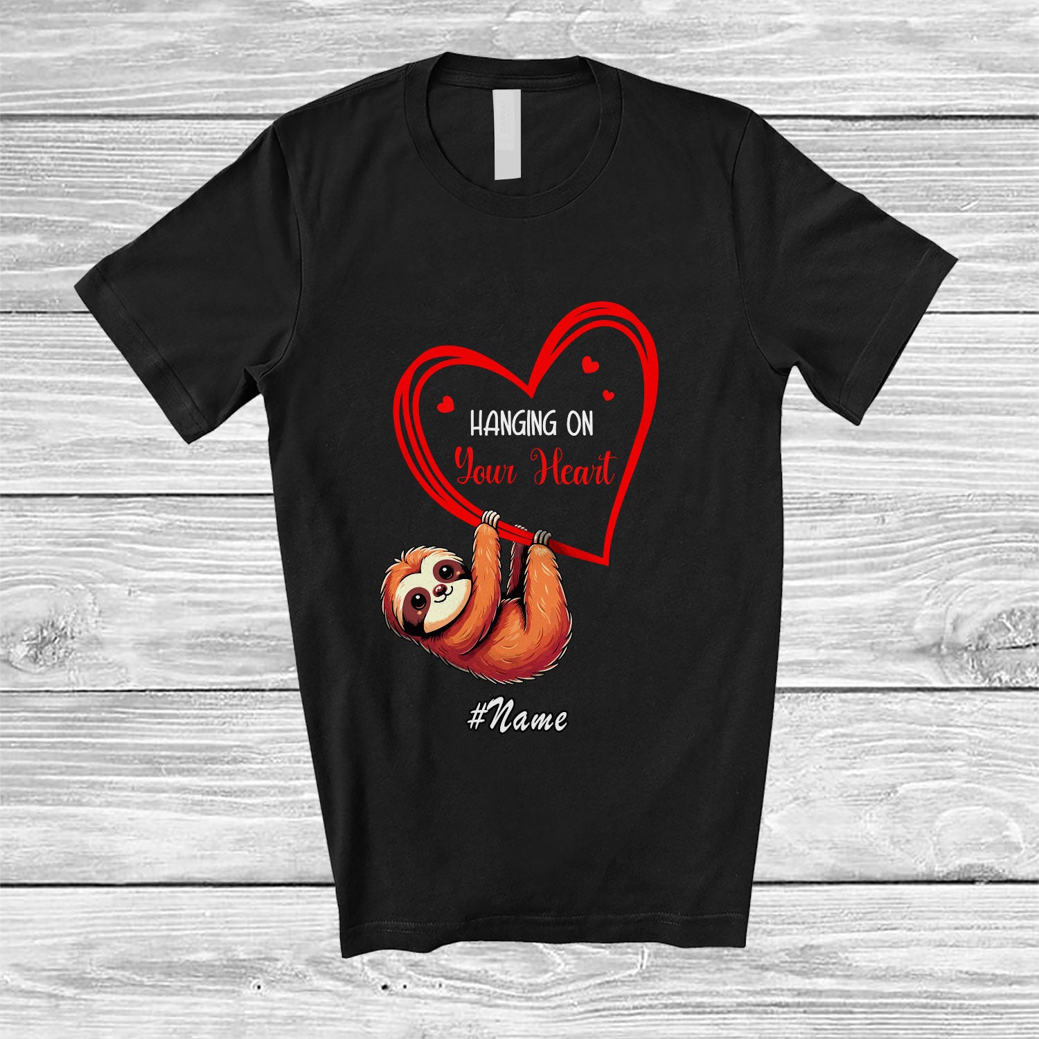 Personalized Custom Name Hanging On Your Heart; Lovely Valentine Sloth Hanging On Heart Couple T-Shirt. This cotton t-shirt is a durable staple product with a classic fit. One of the most popular items, it has a relaxed style made for everyday and casual wear.