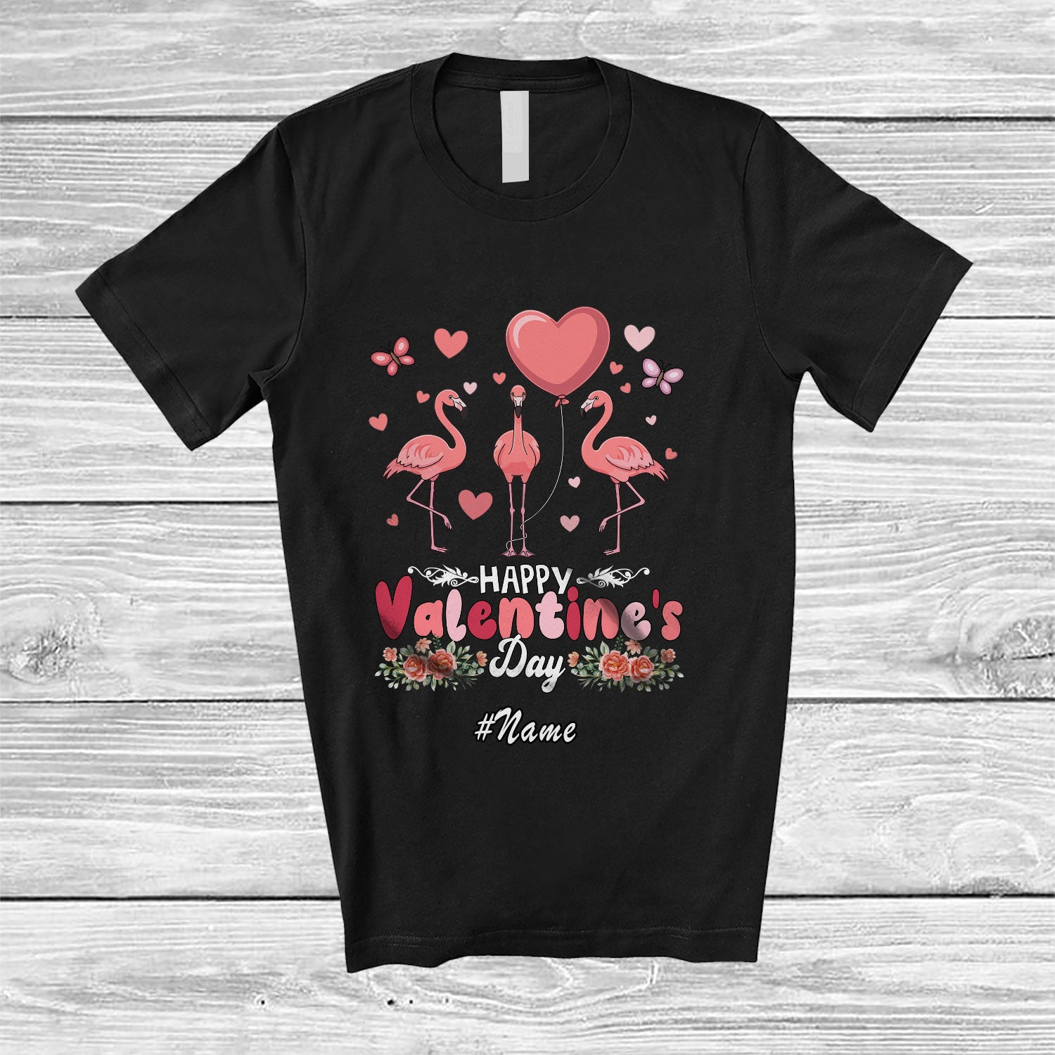 • Personalized Custom Name Happy Valentine's Day; Lovely Three Pink Flamingo Hearts; Couple T-Shirt. This cotton t-shirt is a durable staple product with a classic fit. One of the most popular items, it has a relaxed style made for everyday and casual wear.