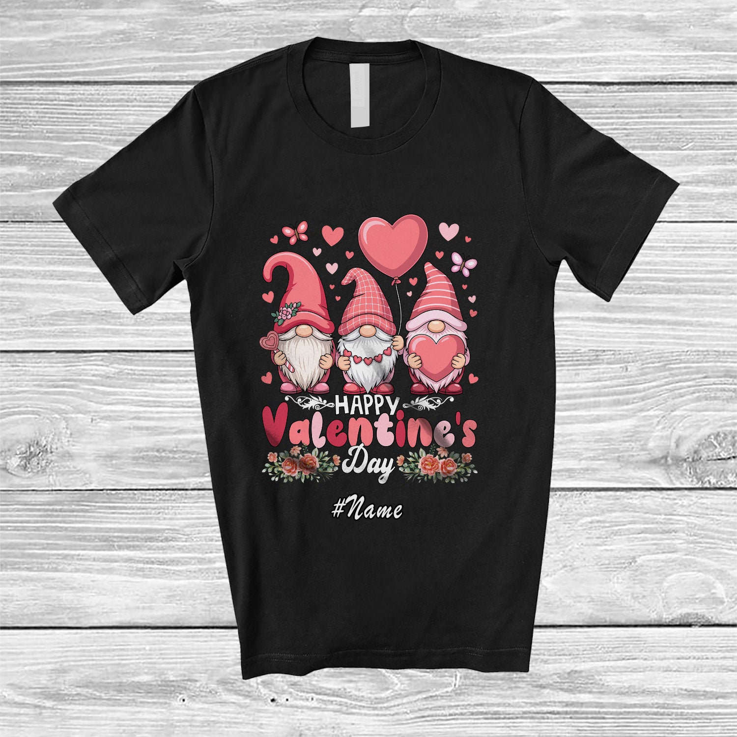 Personalized Custom Name Happy Valentine's Day; Lovely Three Pink Gnomes Hearts Flowers; Couple T-Shirt. This cotton t-shirt is a durable staple product with a classic fit. One of the most popular items, it has a relaxed style made for everyday and casual wear.