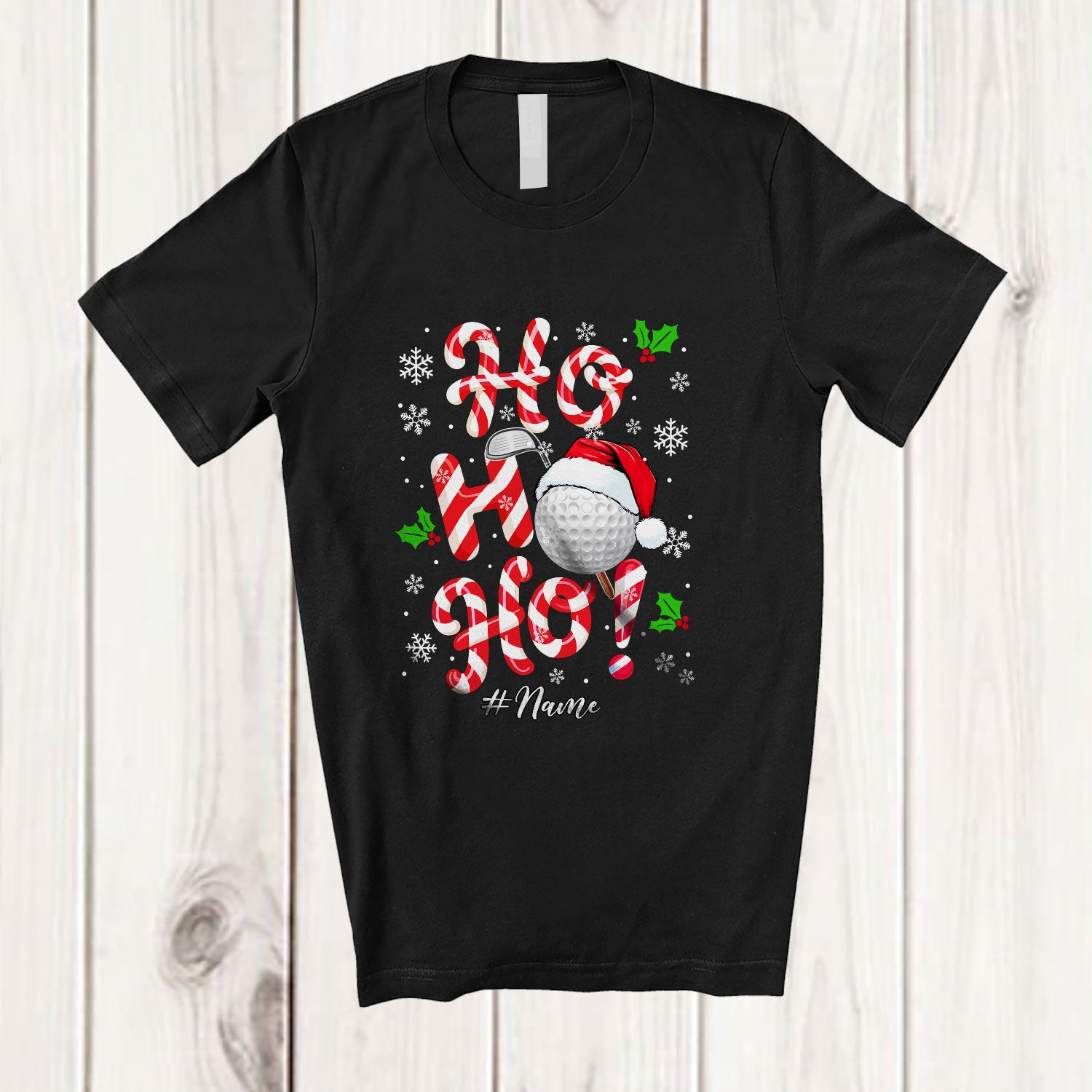• Personalized Custom Name Ho3; Amusing Christmas Candy Canes Golf Player Team; Family T-Shirt. This cotton t-shirt is a durable staple product with a classic fit. One of the most popular items, it has a relaxed style made for everyday and casual wear.