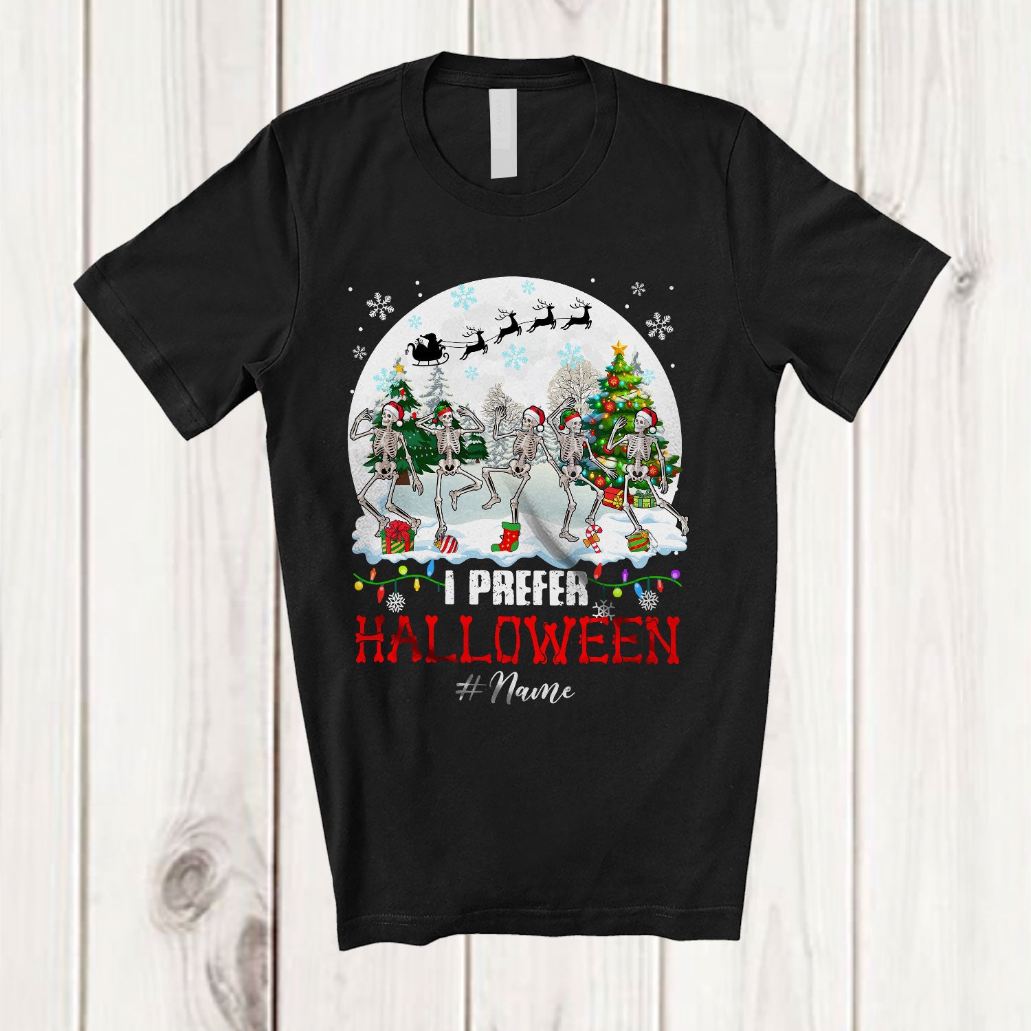 • Personalized Custom Name I Prefer Halloween; Amusing Christmas Moon Dancing Skeletons T-Shirt. This cotton t-shirt is a durable staple product with a classic fit. One of the most popular items, it has a relaxed style made for everyday and casual wear.