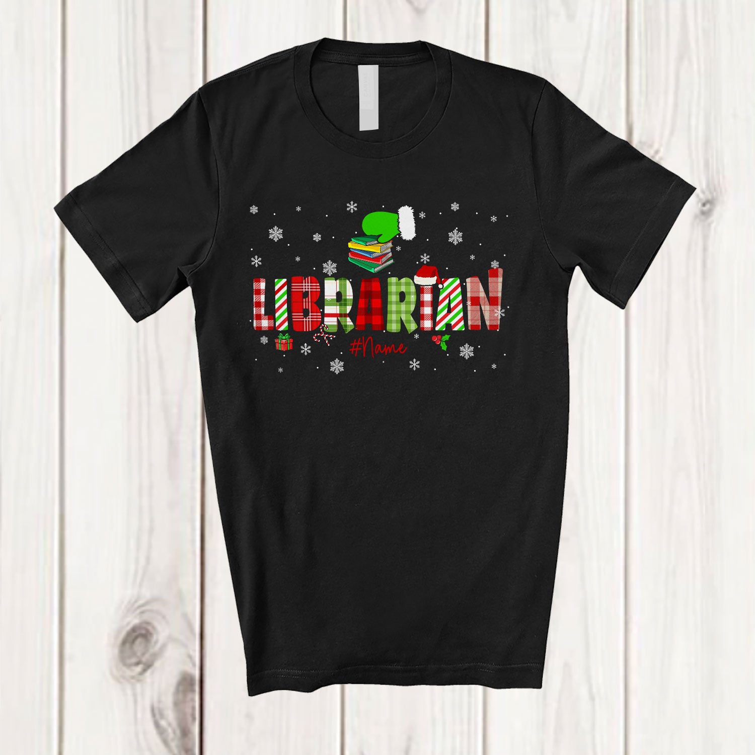 Personalized Custom Name Librarian; Lovely Christmas Plaid Green Santa Hand; Librarian Squad T-Shirt. This cotton t-shirt is a durable staple product with a classic fit. One of the most popular items, it has a relaxed style made for everyday and casual wear.