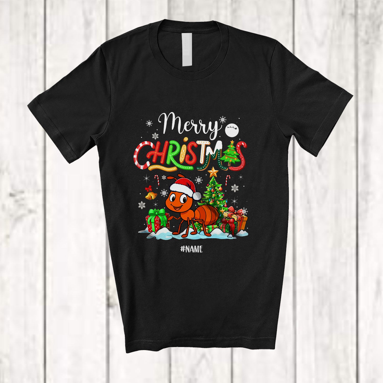 Personalized Custom Name Merry Christmas; Lovely X-mas Tree Snowing Santa Ant Animal T-Shirt