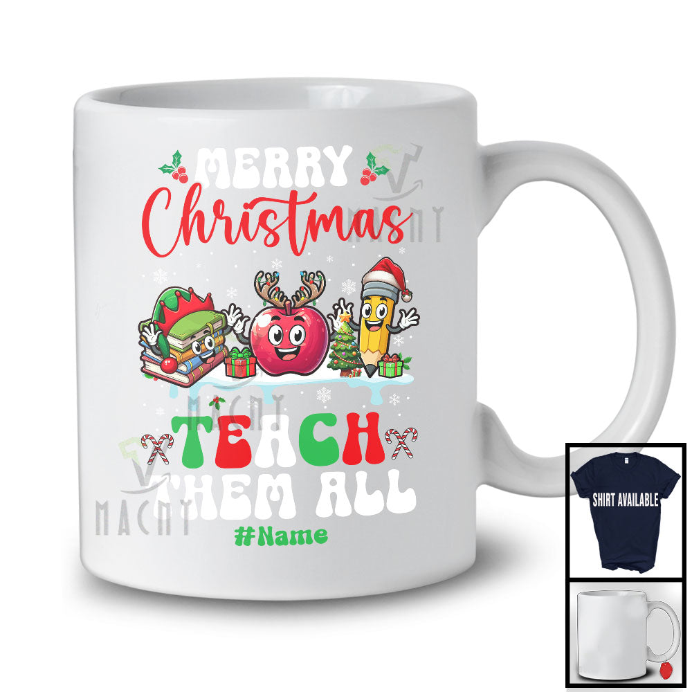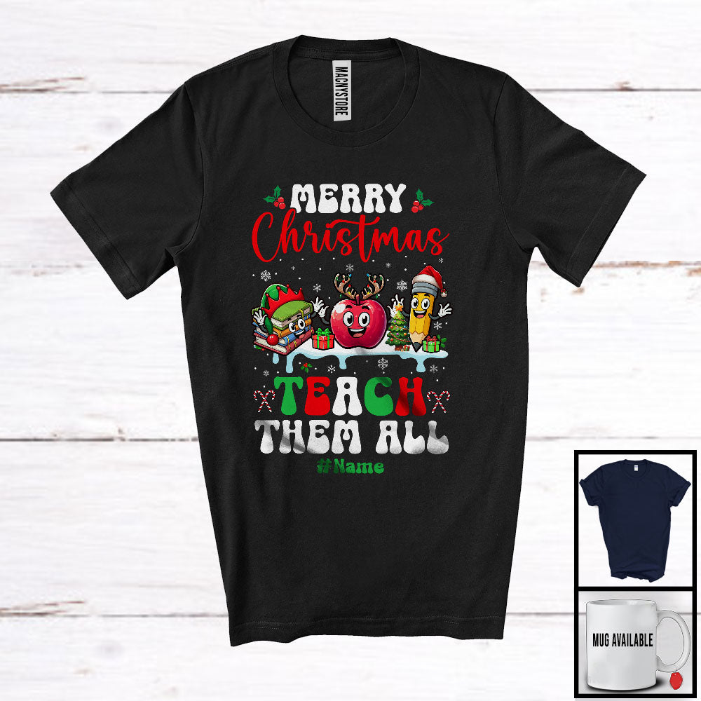 • Personalized Custom Name Merry Christmas Teach Them All; Lovely Three School Things; Teacher T-Shirt. This cotton t-shirt is a durable staple product with a classic fit. One of the most popular items, it has a relaxed style made for everyday and casual wear.