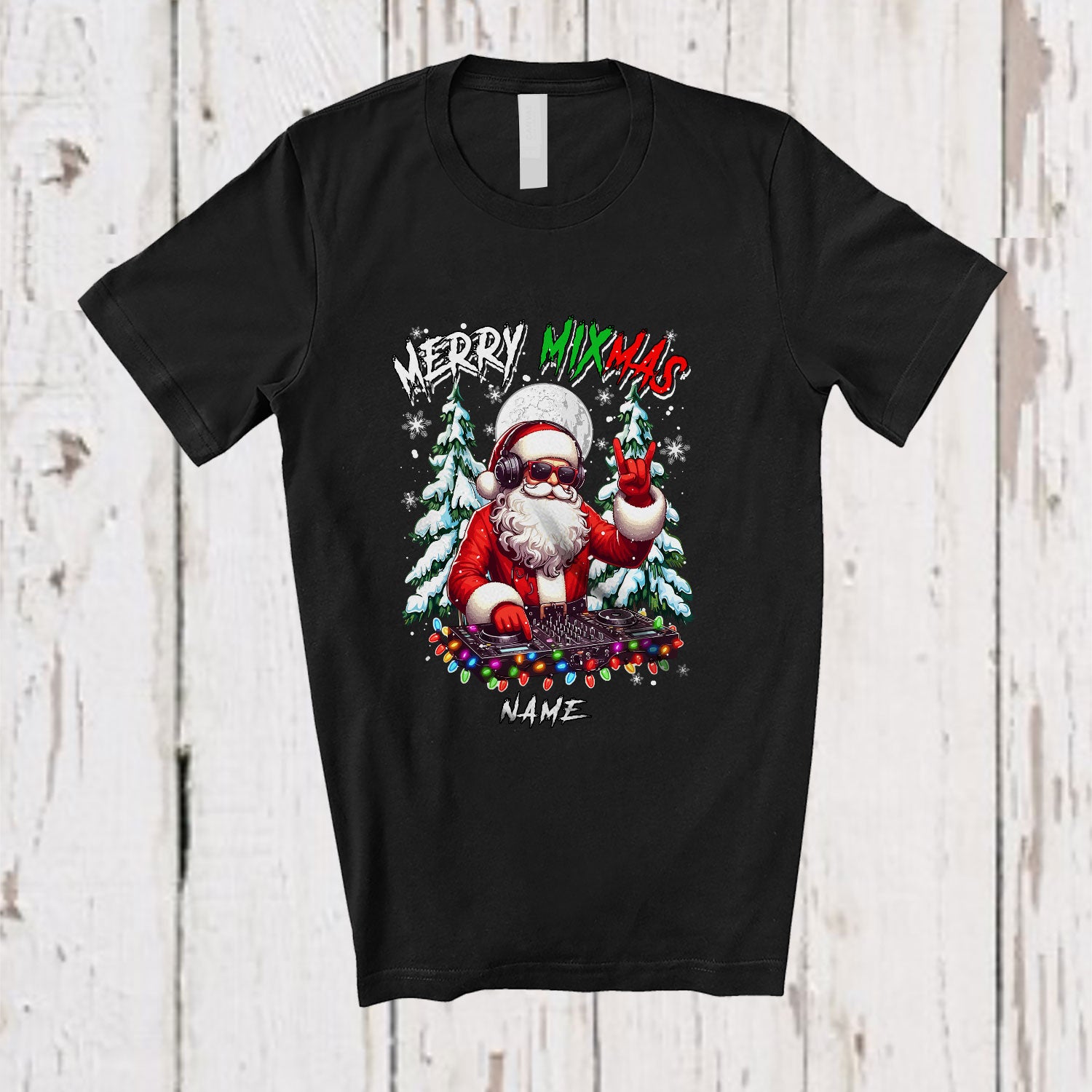 Personalized Custom Name Merry Mixmas; Cheerful Christmas Tree Santa DJ; Music Family T-Shirt