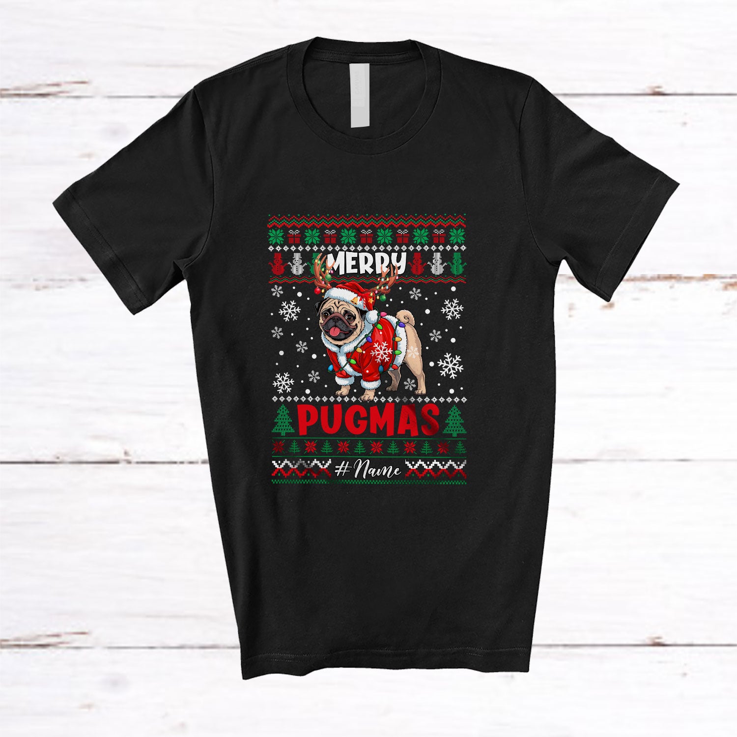Personalized Custom Name Merry Pugmas; Lovely Christmas Lights Sweater Pug Santa Reindeer T-Shirt
