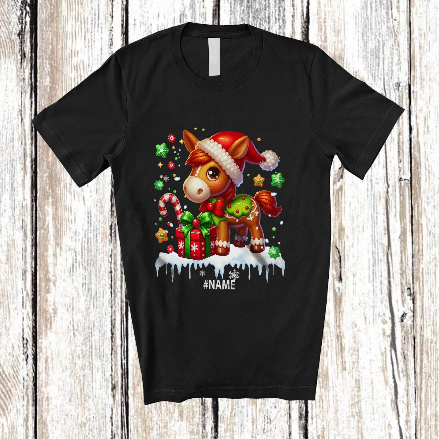 • Personalized Custom Name Mule Santa Gingerbread; Adorable Christmas Baking Baker T-Shirt. This cotton t-shirt is a durable staple product with a classic fit. One of the most popular items, it has a relaxed style made for everyday and casual wear.