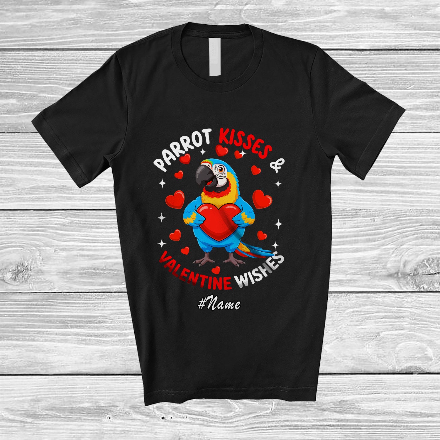 Personalized Custom Name Parrot Kisses Valentine Wishes; Lovely Parrot Hugging Heart Lover Owner T-Shirt. This cotton t-shirt is a durable staple product with a classic fit. One of the most popular items, it has a relaxed style made for everyday and casual wear.
