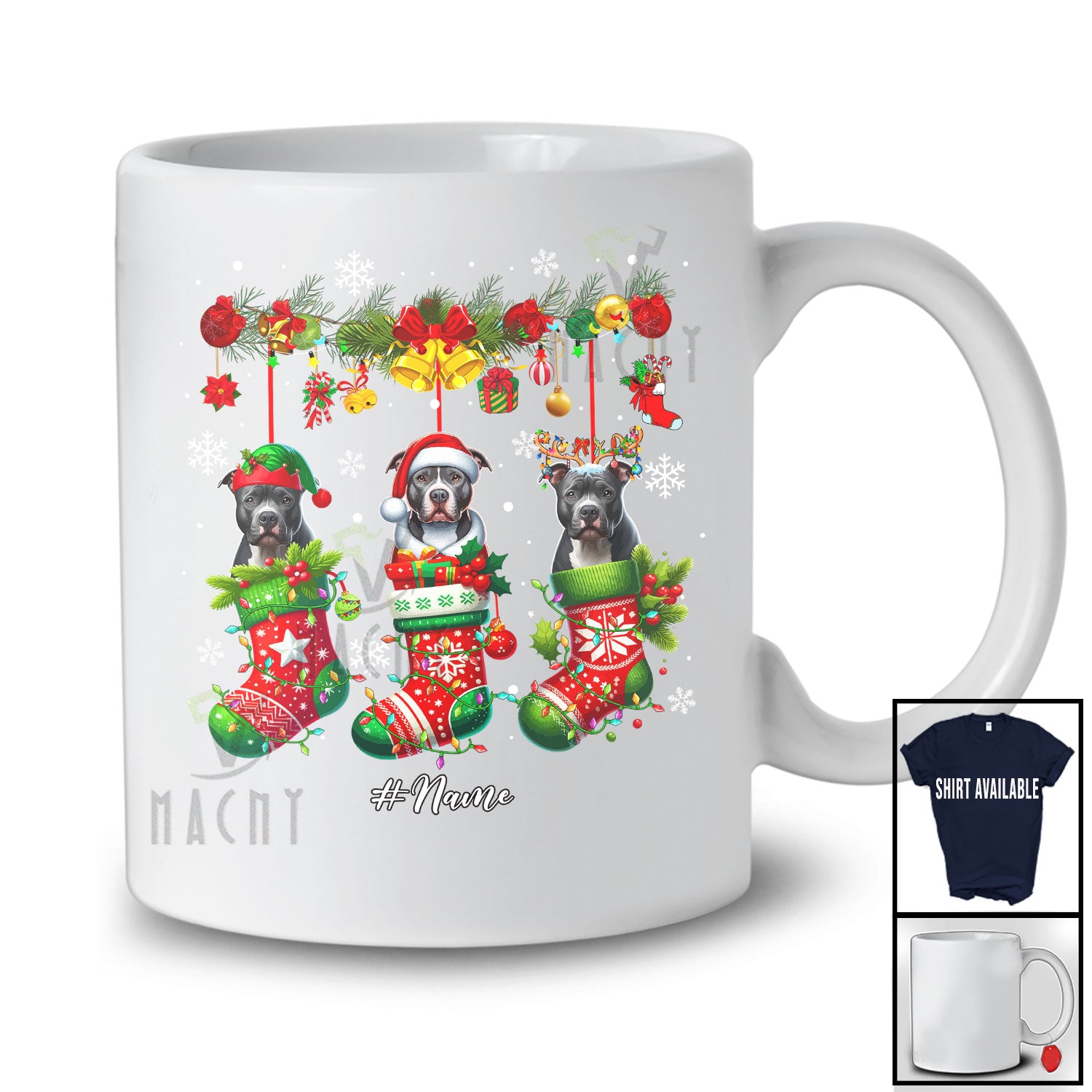 new MacnyStore - Personalized Custom Name Pit Bull Dog In Three Christmas Socks; Lovely X-mas Lights Snow T-Shirt – Macnystore