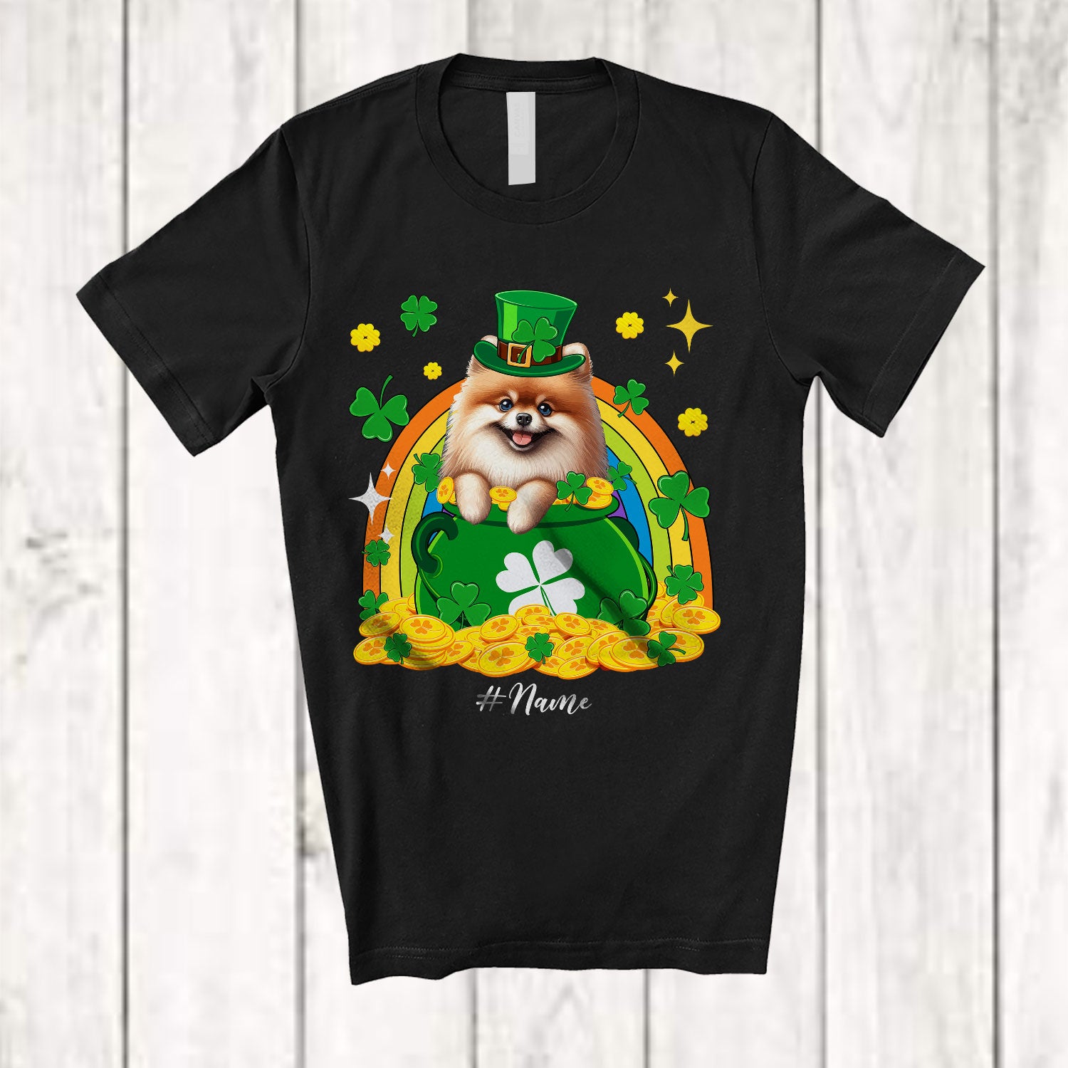 Personalized Custom Name Pomeranian Leprechaun In Pot Of Gold; Lovely St. Patrick's Day Rainbow T-Shirt