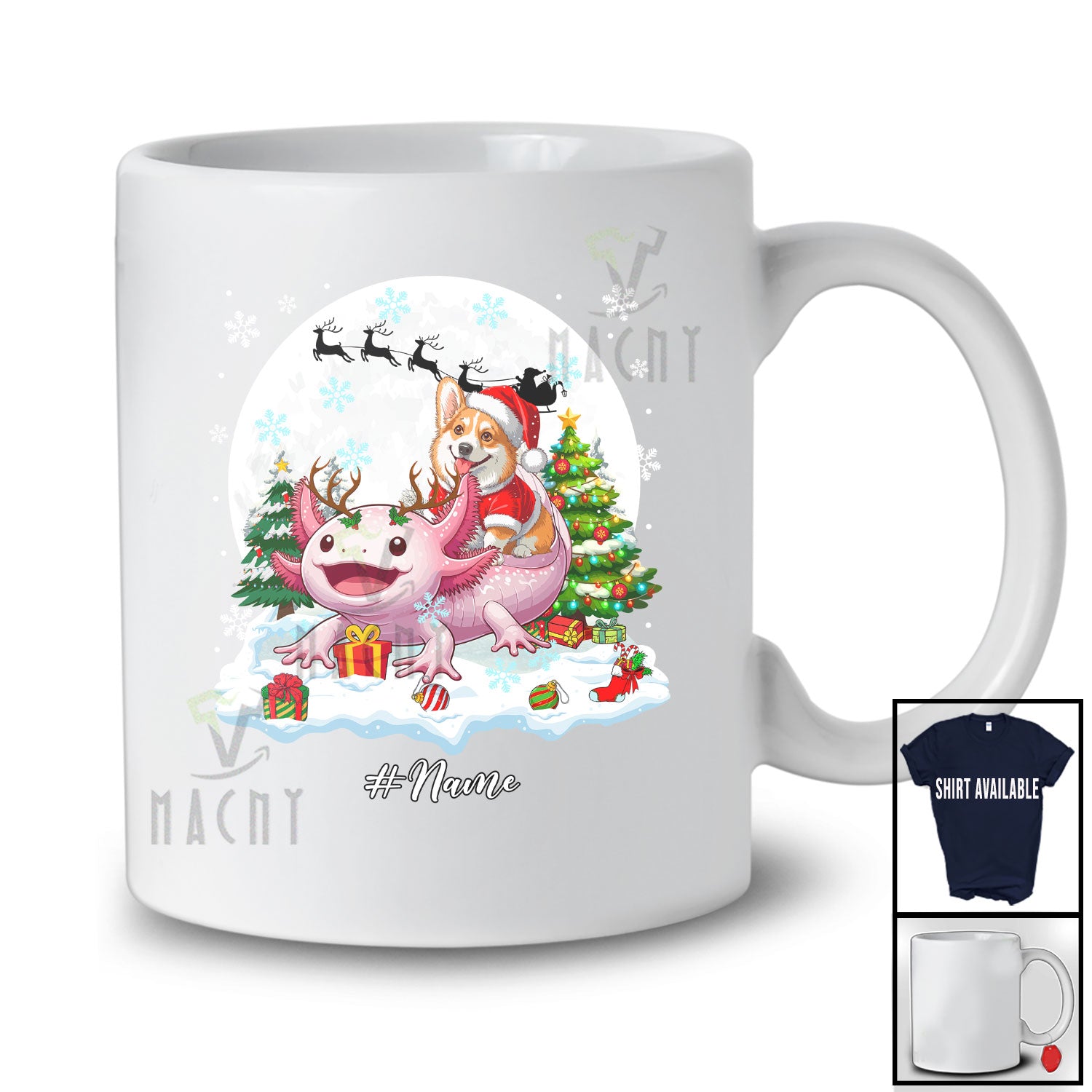 • Personalized Custom Name Santa Corgi Riding Axolotl; Merry Christmas Moon Snow Animal T-Shirt. This cotton t-shirt is a durable staple product with a classic fit. One of the most popular items, it has a relaxed style made for everyday and casual wear.