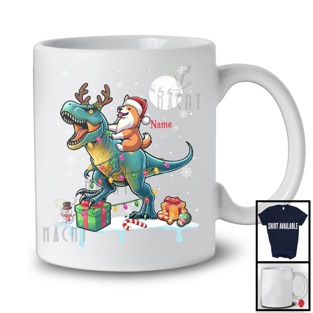 • Personalized Custom Name Santa Corgi Riding Reindeer T-Rex; Adorable Christmas Lights Snow T-Shirt. This cotton t-shirt is a durable staple product with a classic fit. One of the most popular items, it has a relaxed style made for everyday and casual wear.