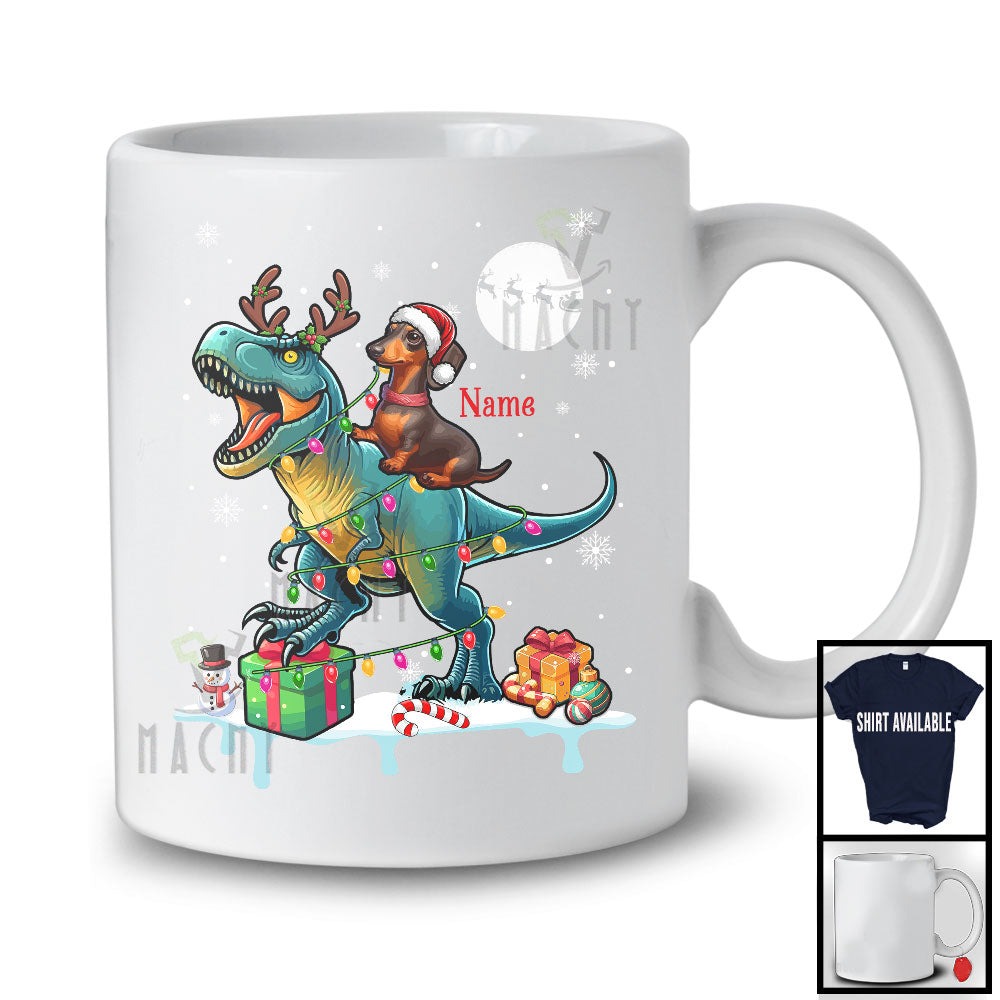 Personalized Custom Name Santa Dachshund Riding Reindeer T-Rex; Adorable Christmas Lights Snow T-Shirt