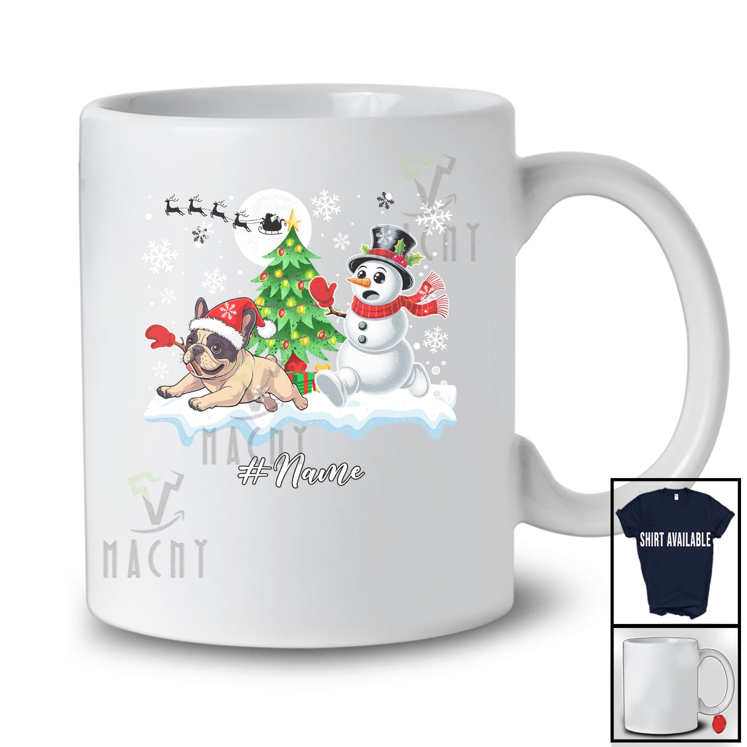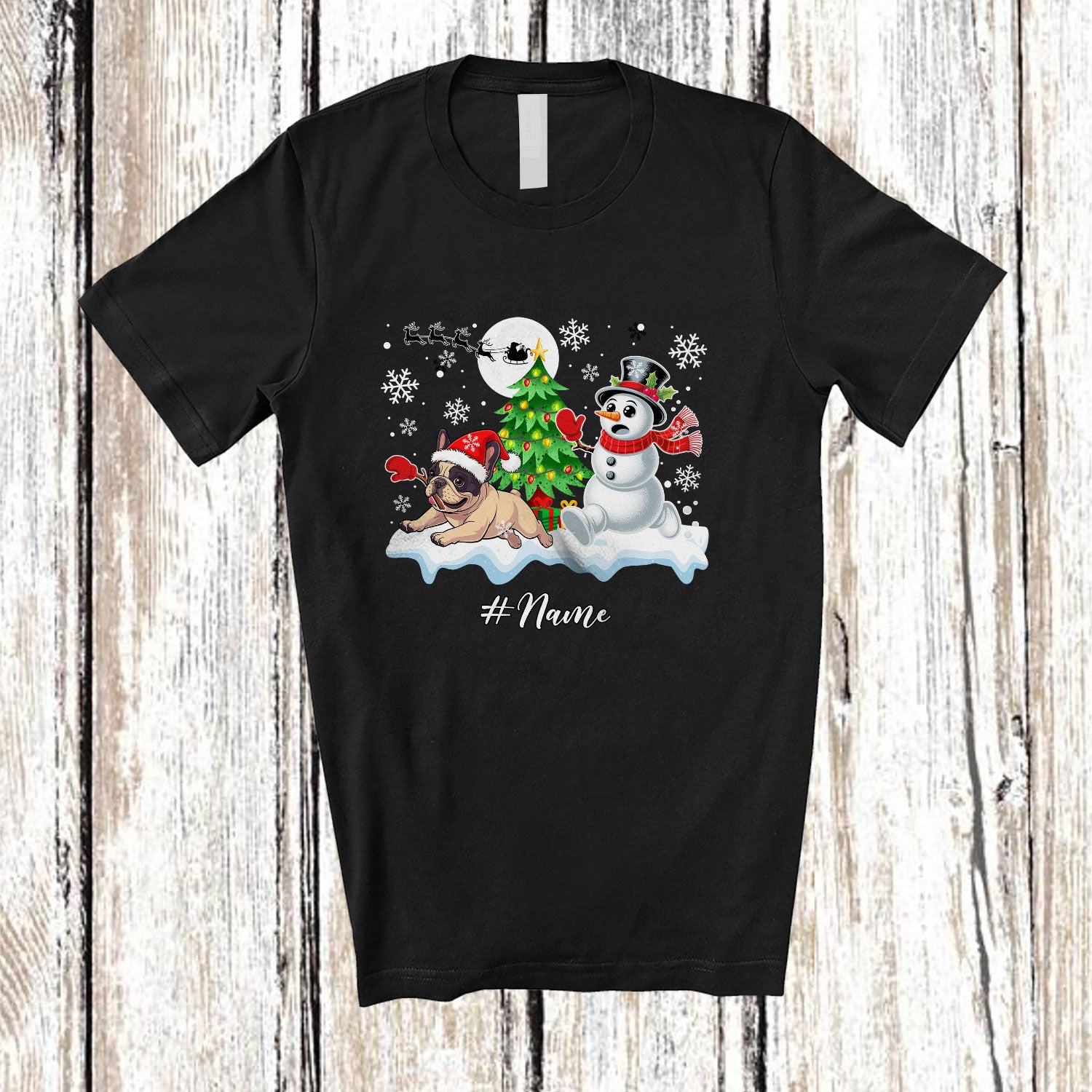 • Personalized Custom Name Santa French Bulldog Snowman; Lovely Christmas Tree Friends Family T-Shirt. This cotton t-shirt is a durable staple product with a classic fit. One of the most popular items, it has a relaxed style made for everyday and casual wear.