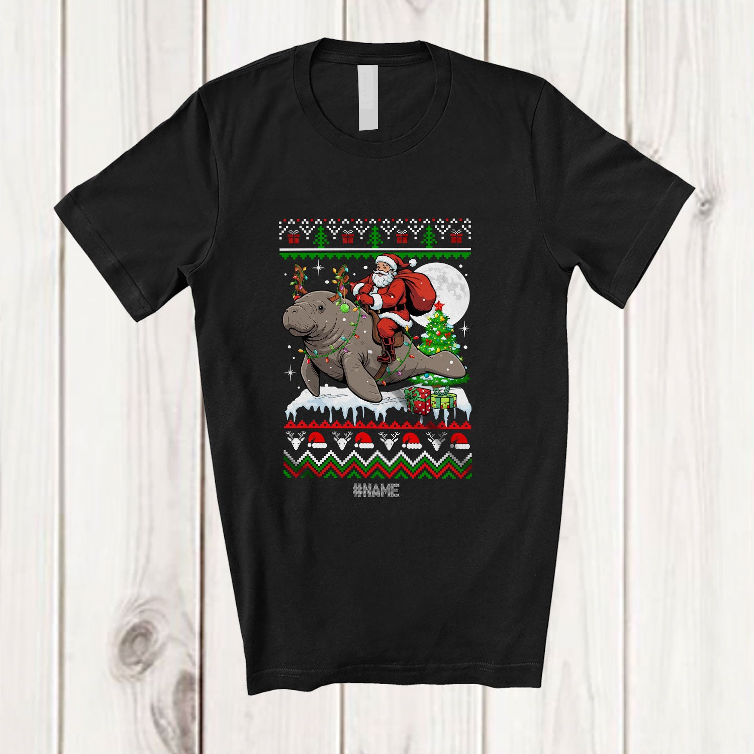Personalized Custom Name Santa Riding Manatee; Amusing Christmas Sweater Tree Sea Animal T-Shirt