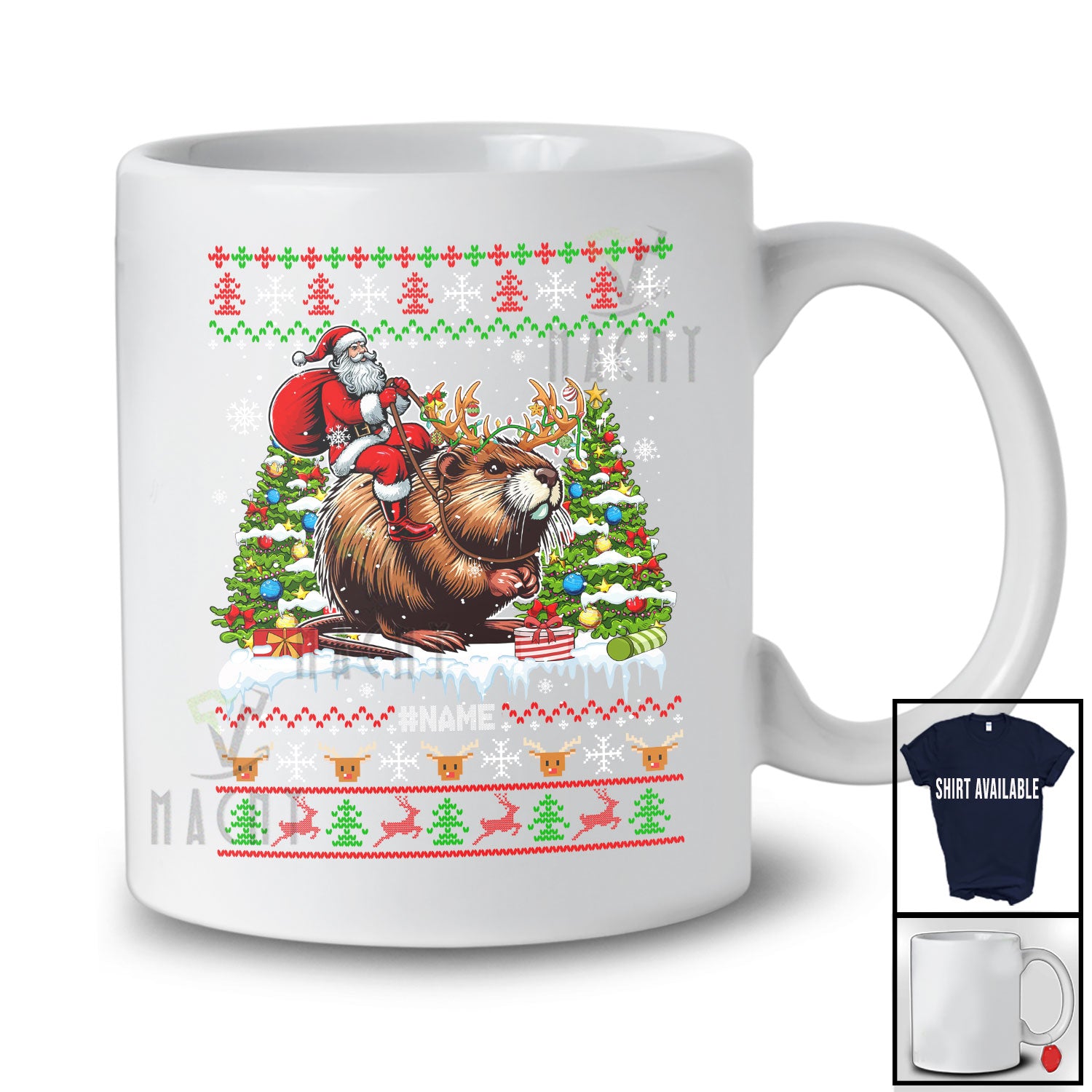 Personalized Custom Name Santa Riding Muskrat; Awesome Christmas Tree Sweater Muskrat Animal T-Shirt. This cotton t-shirt is a durable staple product with a classic fit. One of the most popular items, it has a relaxed style made for everyday and casual wear.