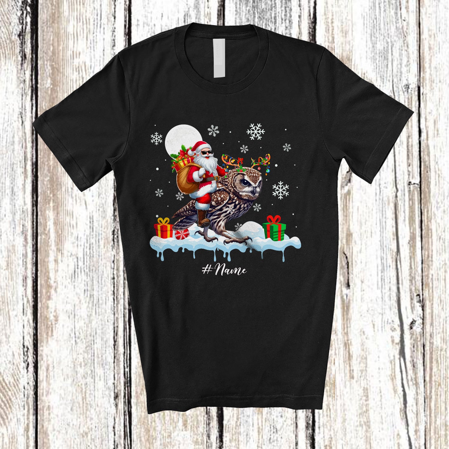 Personalized Custom Name Santa Riding Owl; Awesome Christmas Snowing Bird; Family T-Shirt. This cotton t-shirt is a durable staple product with a classic fit. One of the most popular items, it has a relaxed style made for everyday and casual wear.