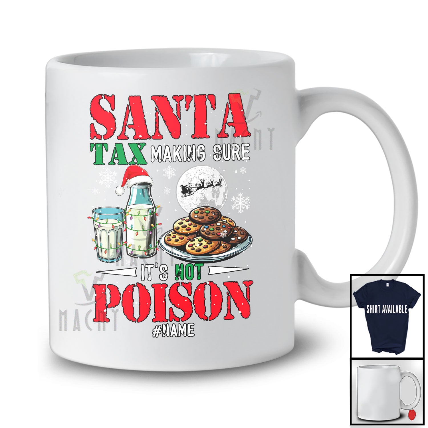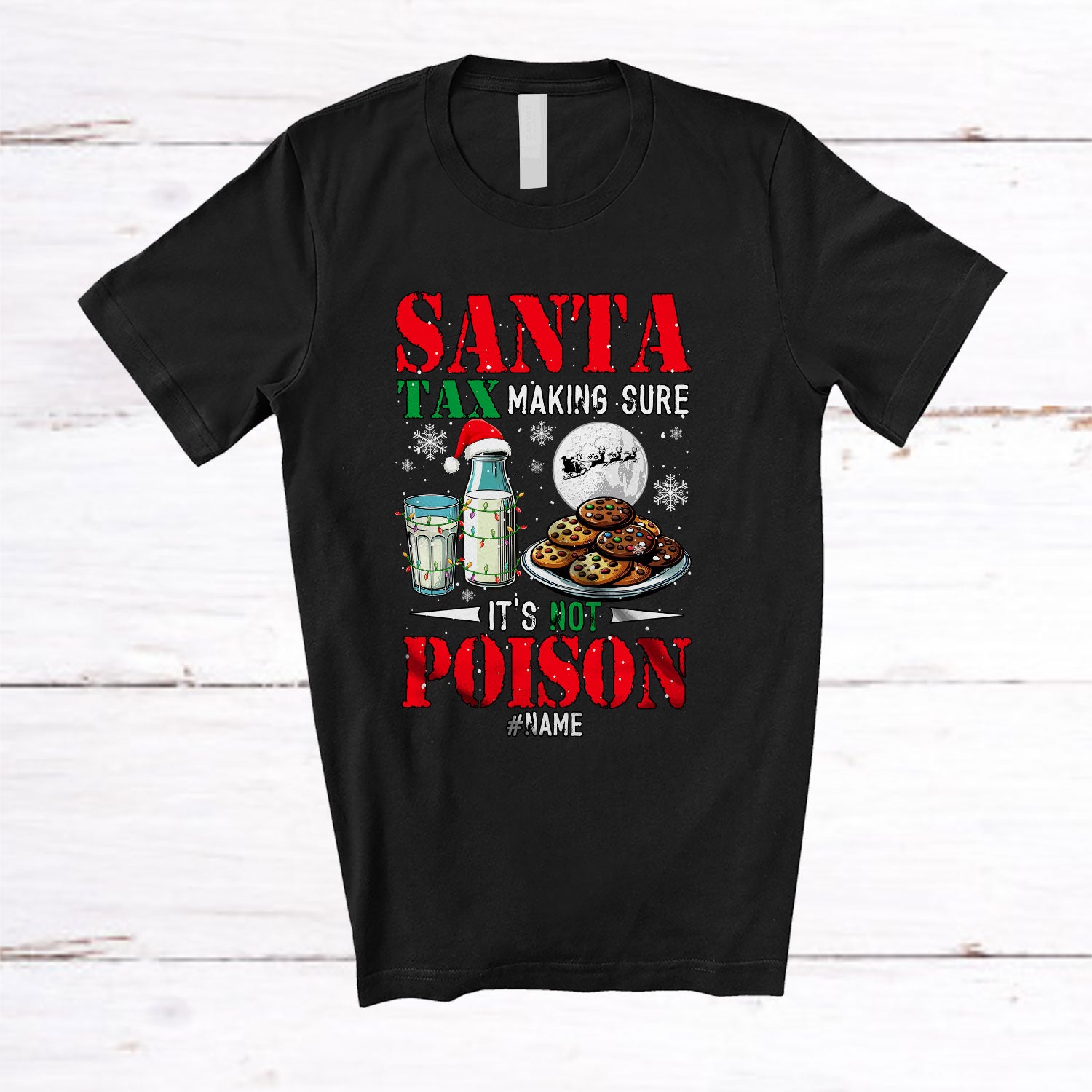 • Personalized Custom Name Santa Tax Making Sure Not Poison; Amusing Christmas Milk Cookies T-Shirt. This cotton t-shirt is a durable staple product with a classic fit. One of the most popular items, it has a relaxed style made for everyday and casual wear.