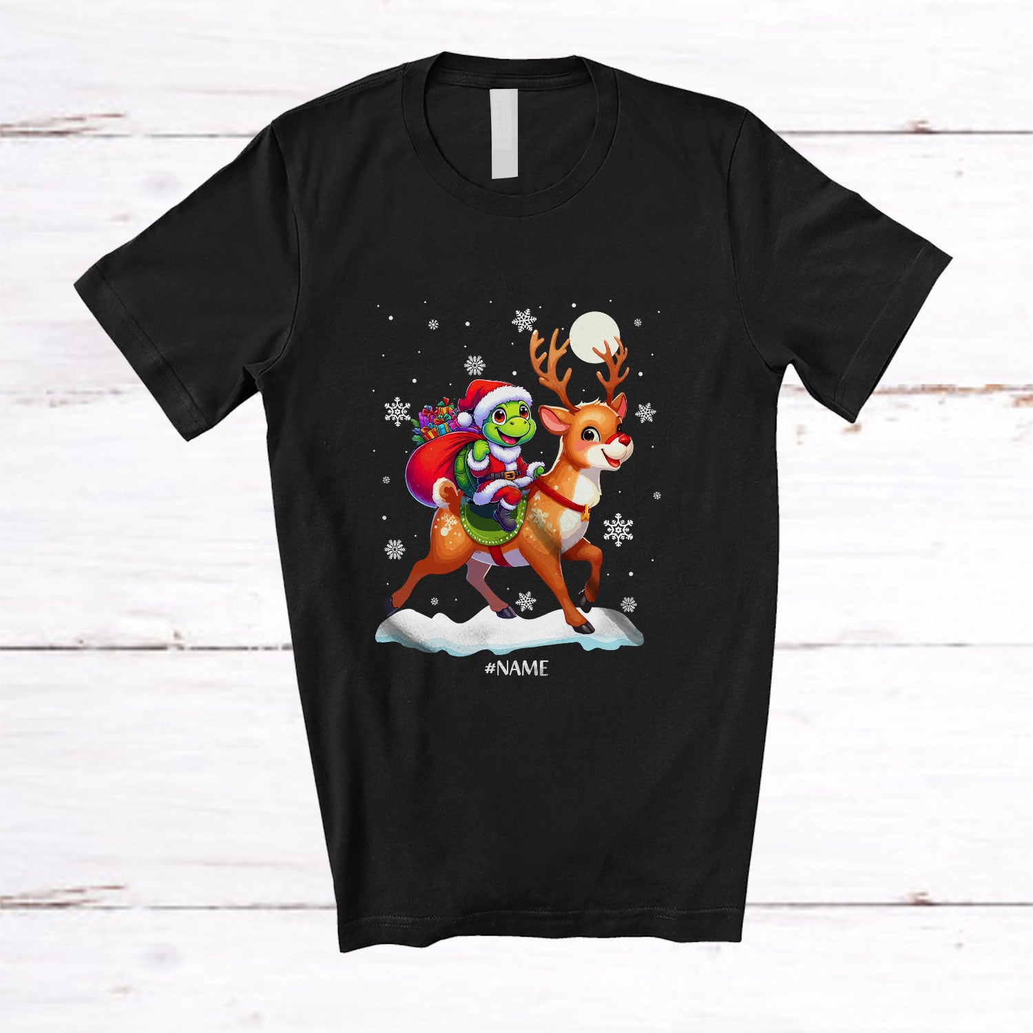 Personalized Custom Name Santa Turtle Riding Reindeer; Amusing Christmas Animal Lover T-Shirt