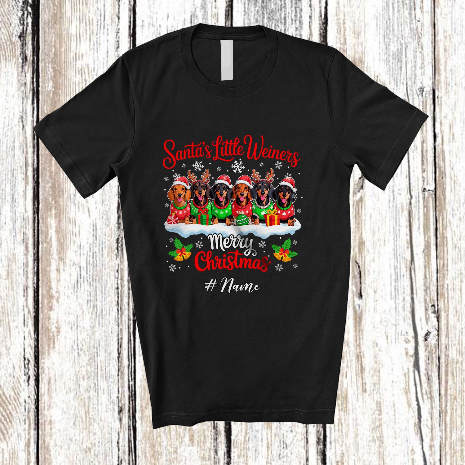 • Personalized Custom Name Santa's Little Weiners; Merry Christmas Reindeer Santa Dachshund T-Shirt. This cotton t-shirt is a durable staple product with a classic fit. One of the most popular items, it has a relaxed style made for everyday and casual wear.