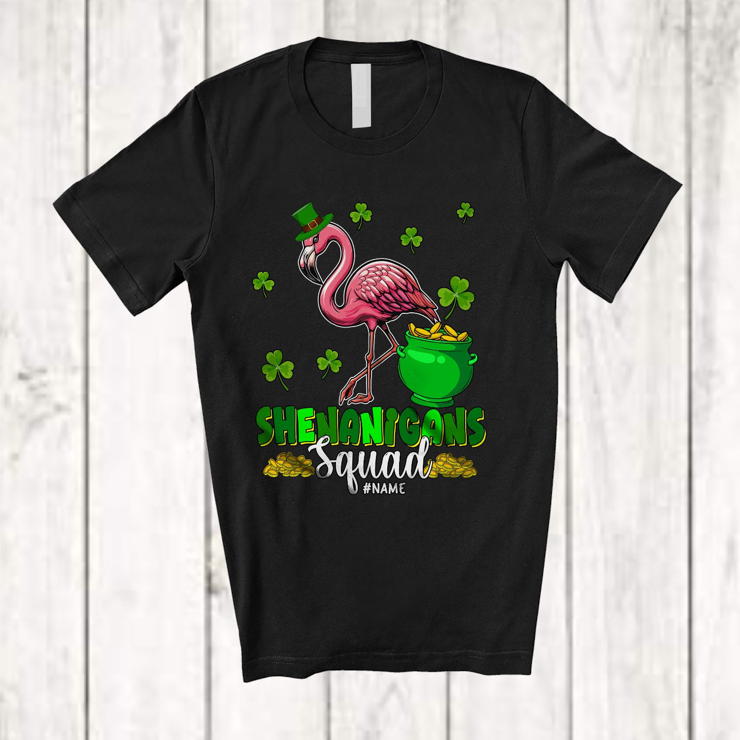 The Personalized Custom Name Shenanigans Squad; Amusing St. Patrick's Day Flamingo Bird; Family T-Shirt is evocative, to say the least, but that's why you're drawn to it in the first place.
